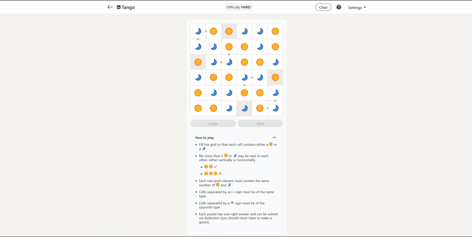 Сегодняшняя головоломка Tango приятна! Она начинается всего с четырех заполненных клеток, что делает её относительно простой, но всё ещё очень увлекательной. Надеюсь, вам понравится её решать так же, как и мне.