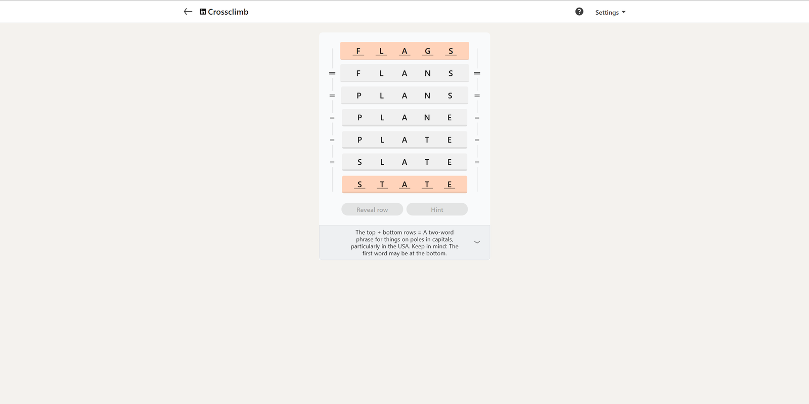 Вот решение сегодняшнего LinkedIn Crossclimb: