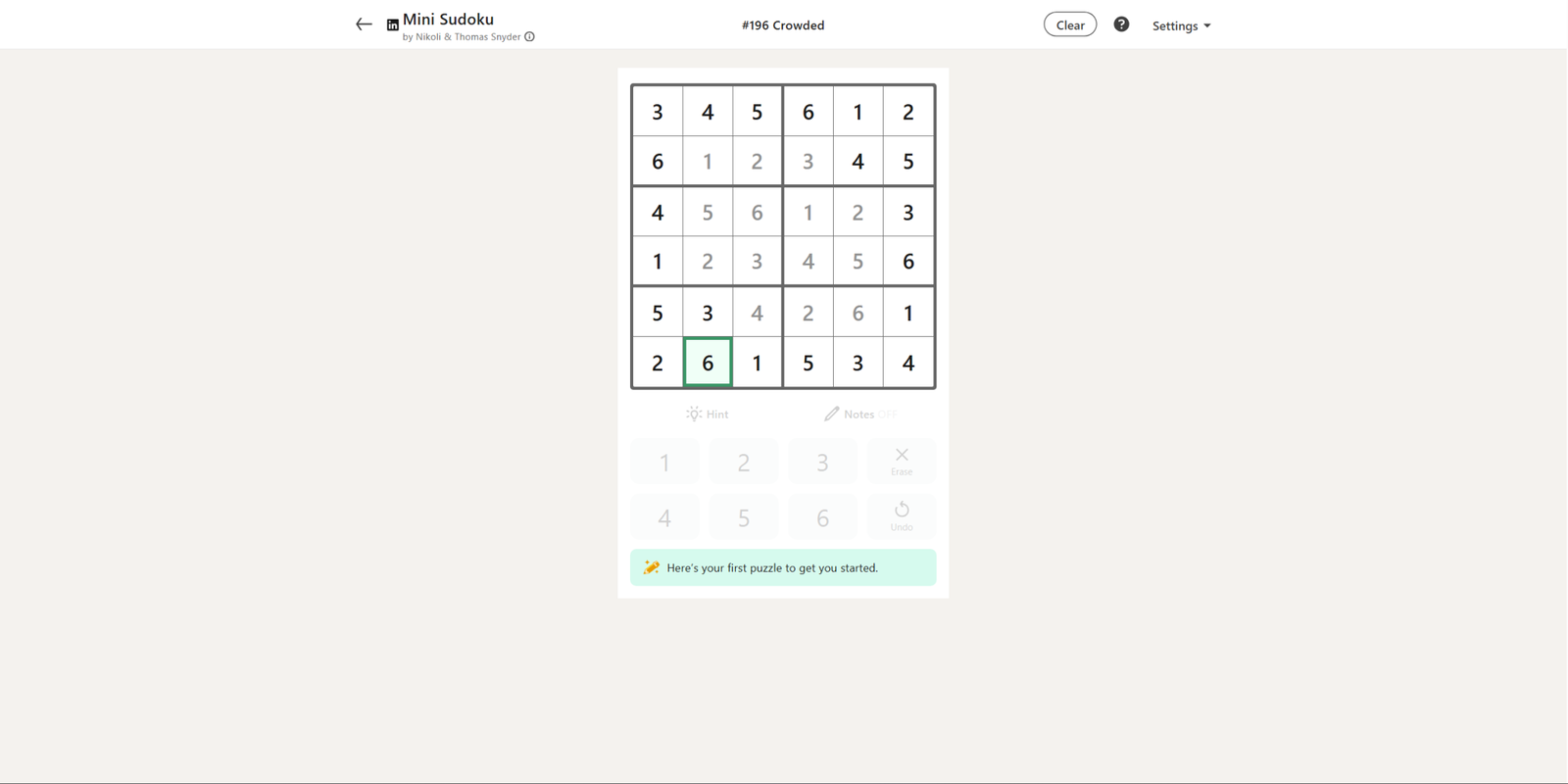 Сегодняшняя мини-судоку, под названием ‘Crowded,’ довольно проста. В ней уже заполнено четырнадцать чисел, что облегчает её решение.