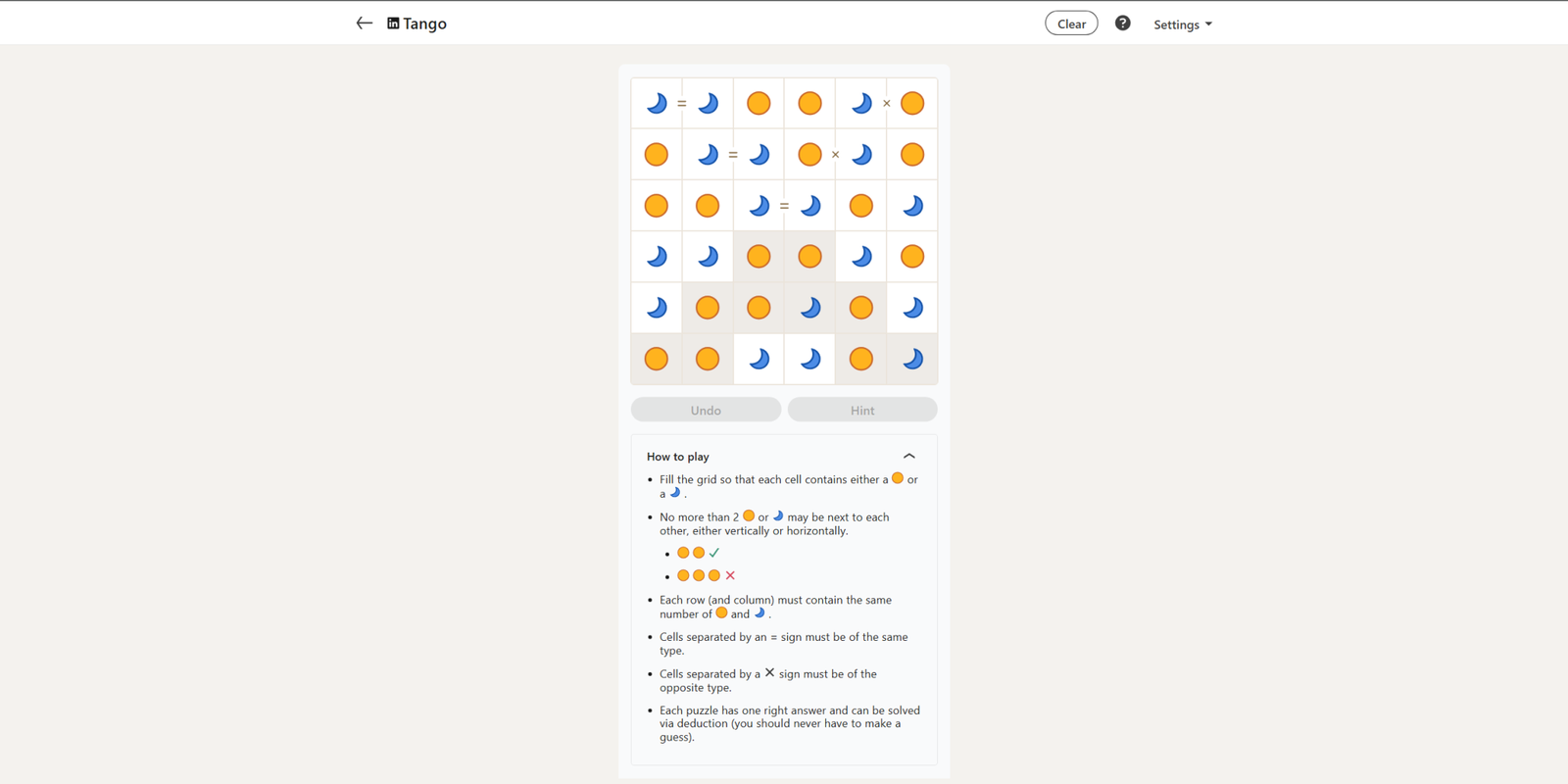 Сегодняшняя головоломка Tango довольно прямолинейна. Она начинается с десяти уже заполненных квадратов, и оттуда остальная сетка относительно легко заполняется, учитывая расположение и форму этих начальных ответов.