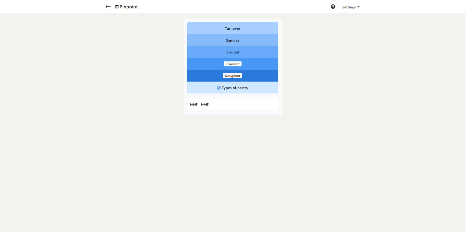 Подсказки начинаются со Strudel, и в этот момент вы, вероятно, близки к тому, чтобы понять ответ. С Croissant в качестве следующей подсказки всё становится довольно ясно. Наконец, Doughnut подтверждает ответ: разные виды выпечки.