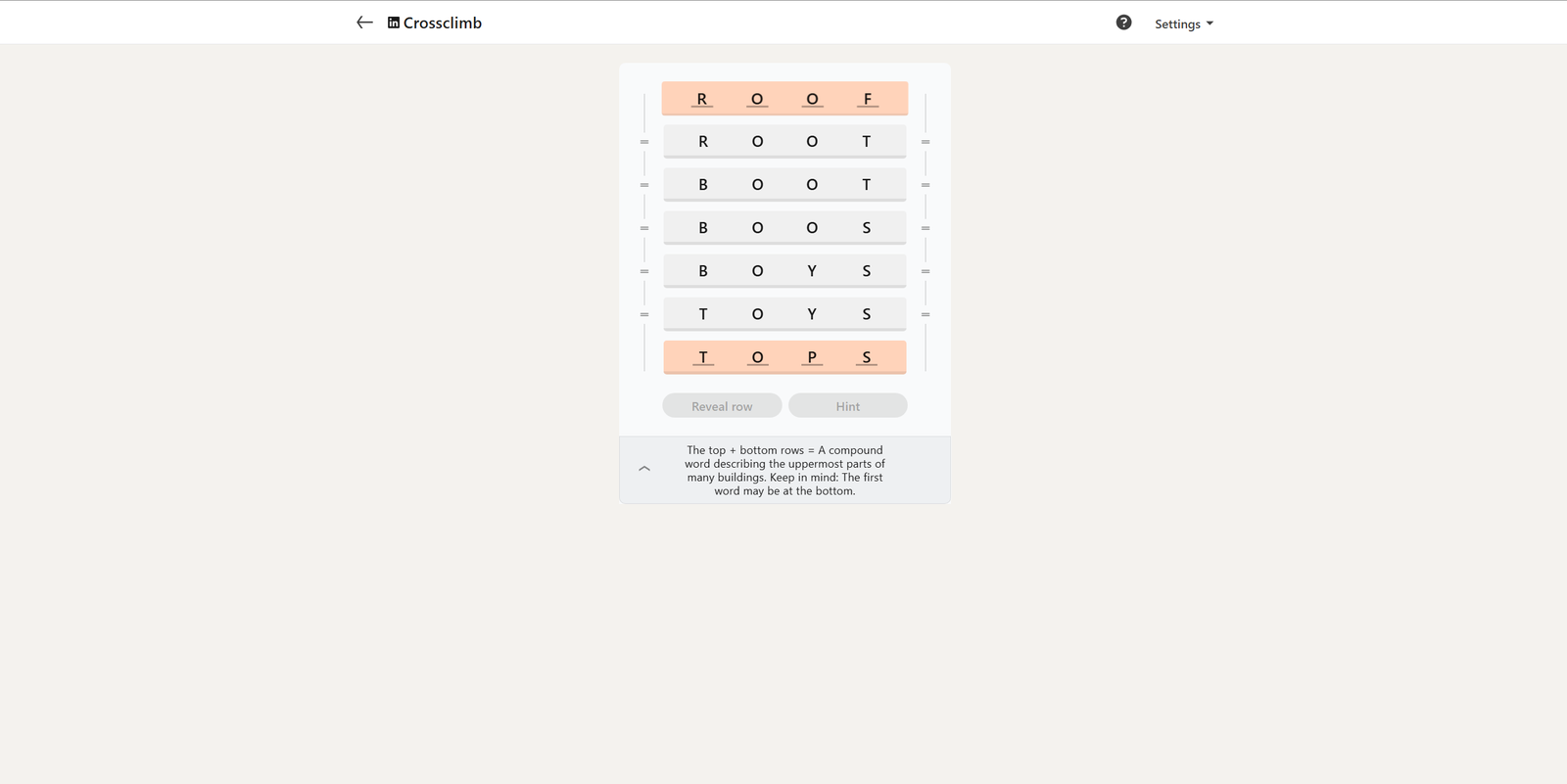 Вот решение для сегодняшнего LinkedIn Crossclimb: