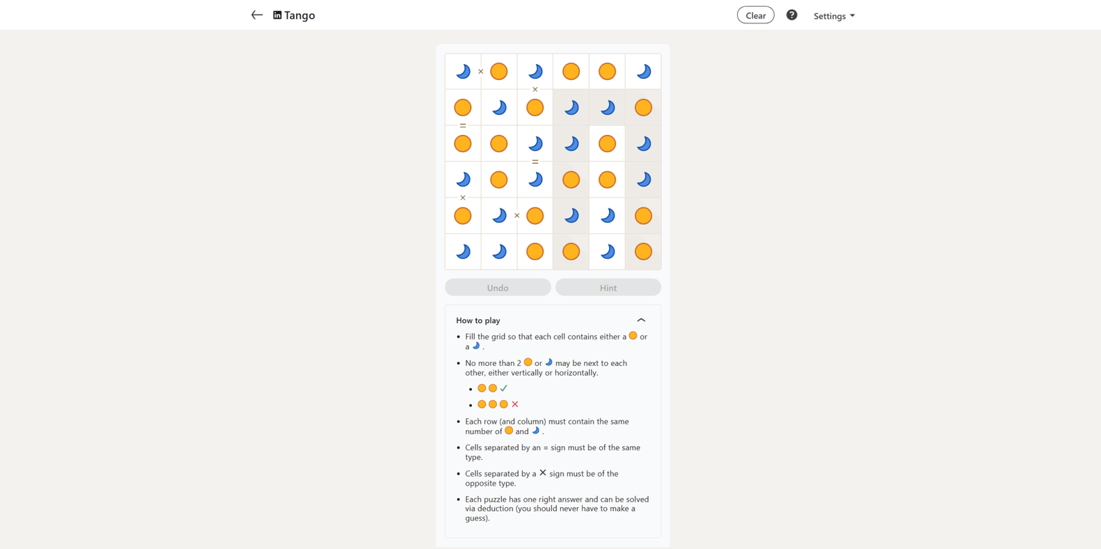 Сегодняшняя головоломка Tango довольно прямолинейна. Она начинается с одиннадцати уже заполненных квадратов, а в остальной части сетки в основном используются Xs и знаки равенства для решения.
