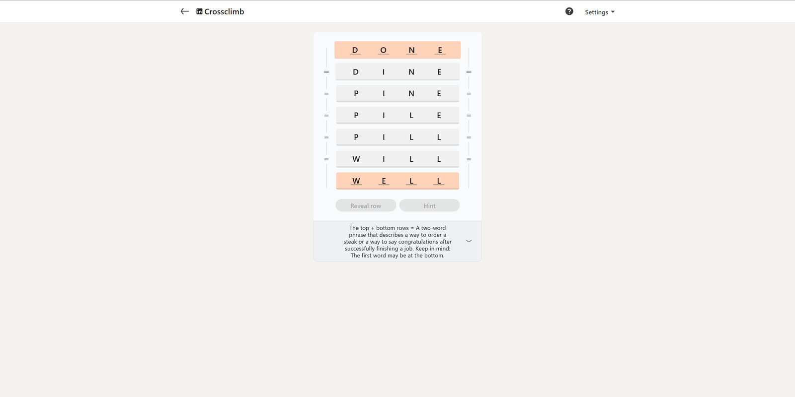 Вот решение сегодняшнего LinkedIn Crossclimb: