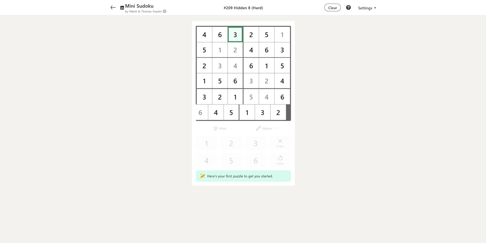 Финальная головоломка Mini Sudoku на этой неделе — это задача ‘Hidden 8’, оцененная как сложная. Она начинается с десяти уже заполненных чисел, и хотя она не невероятно сложная, она немного сложнее, чем предыдущие головоломки на этой неделе.