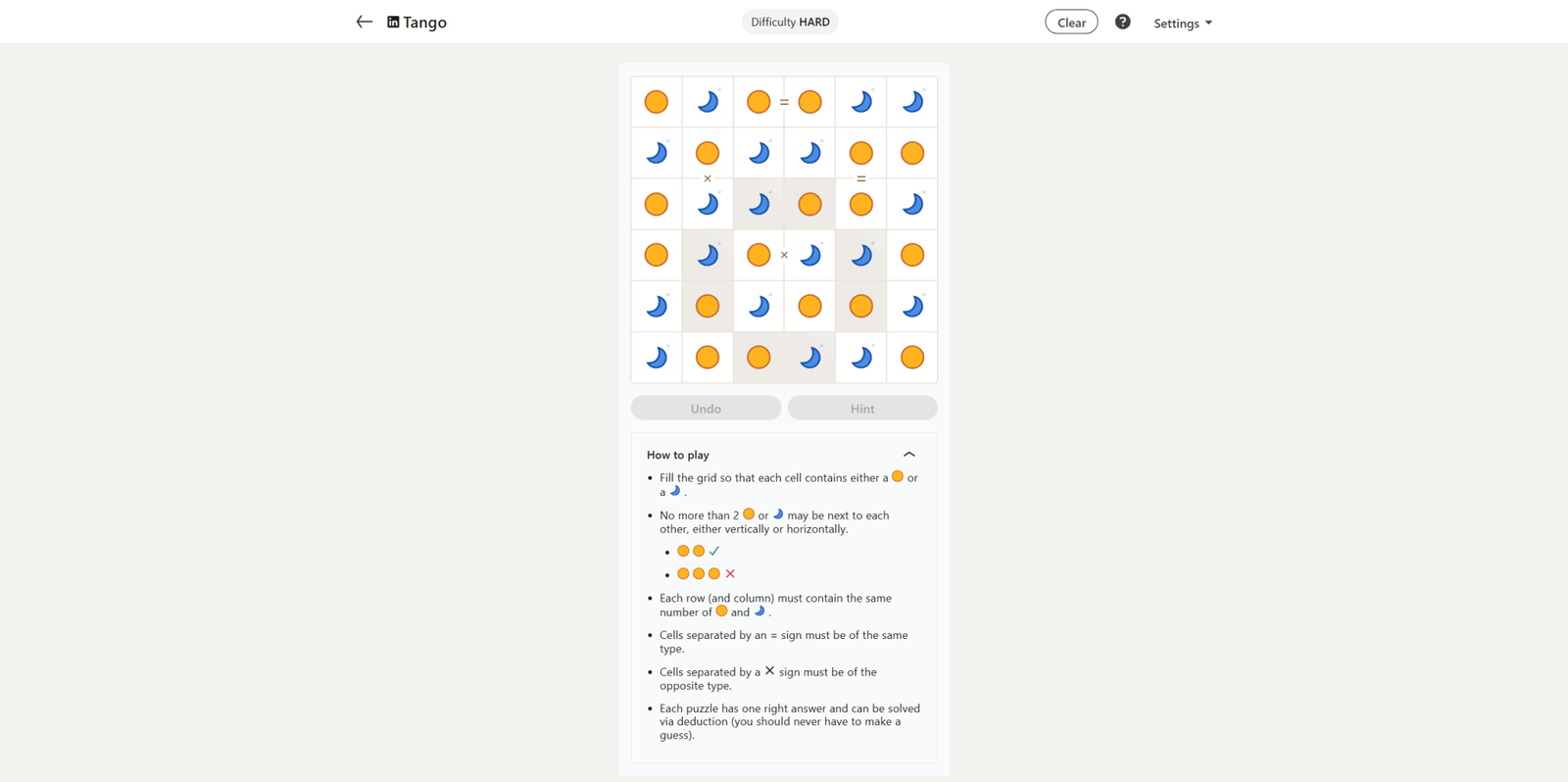Сегодняшняя головоломка Tango имеет восемь уже заполненных квадратов. Она немного сложнее, чем другие головоломки на этой неделе, но всё ещё относительно легко решается.