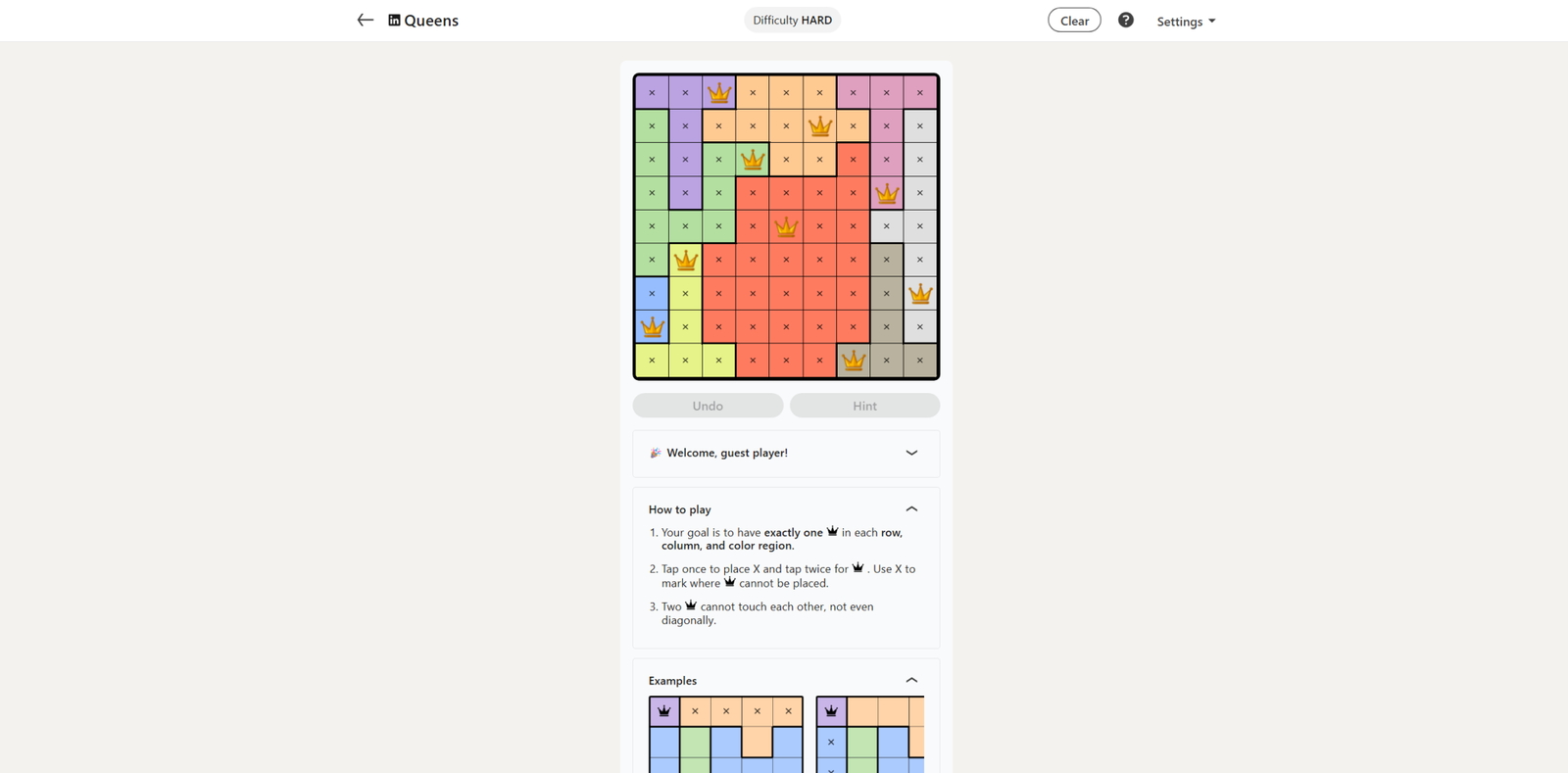 Мы завершаем неделю с более крупным головоломкой 9×9 для сегодняшнего челленджа Queens. Он разработан таким образом, чтобы быть достаточно простым в решении благодаря необычной форме цветных элементов.