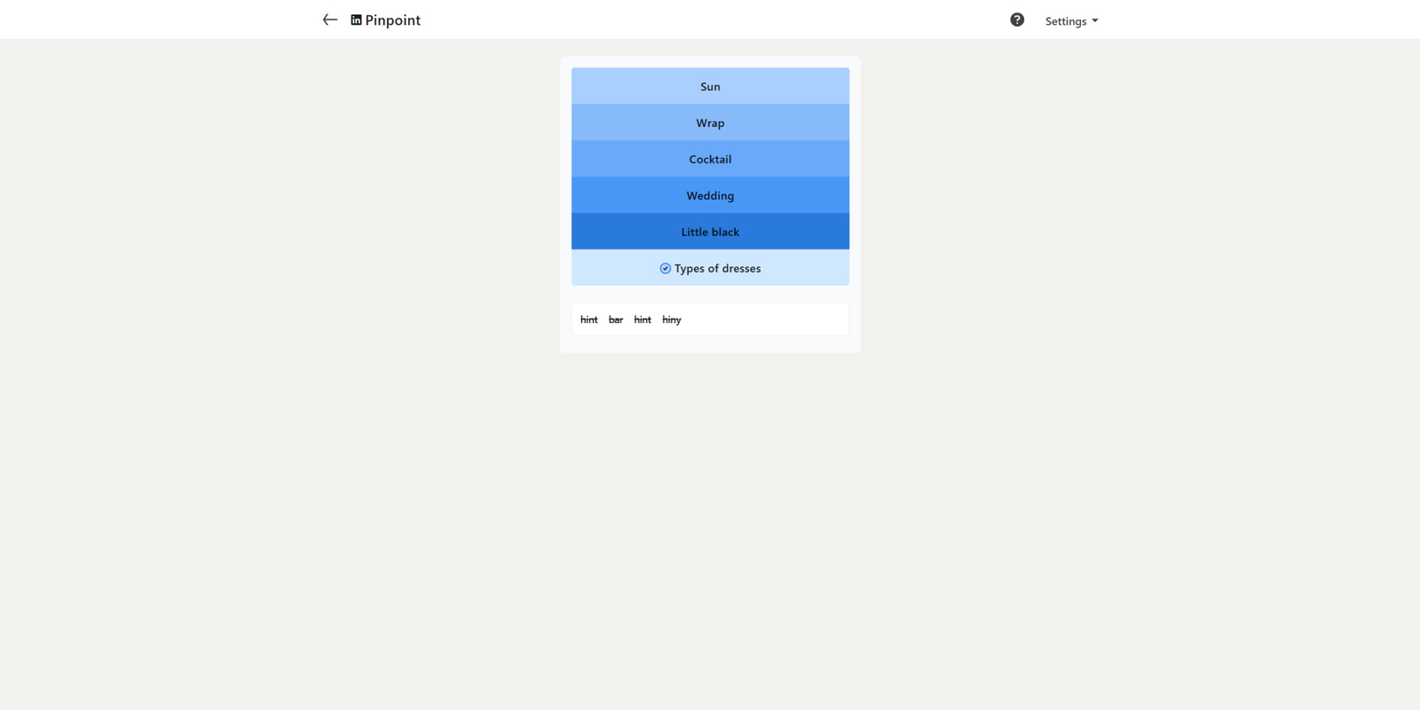 Третья подсказка — ‘Cocktail’, что является неплохим намеком, но, вероятно, сбивает с толку многих игроков, хотя некоторые могут догадаться. Четвертая подсказка, ‘Wedding’, начинает делать ответ гораздо яснее. Наконец, подсказка ‘Little black’ раскрывает ответ: Типы платьев.
