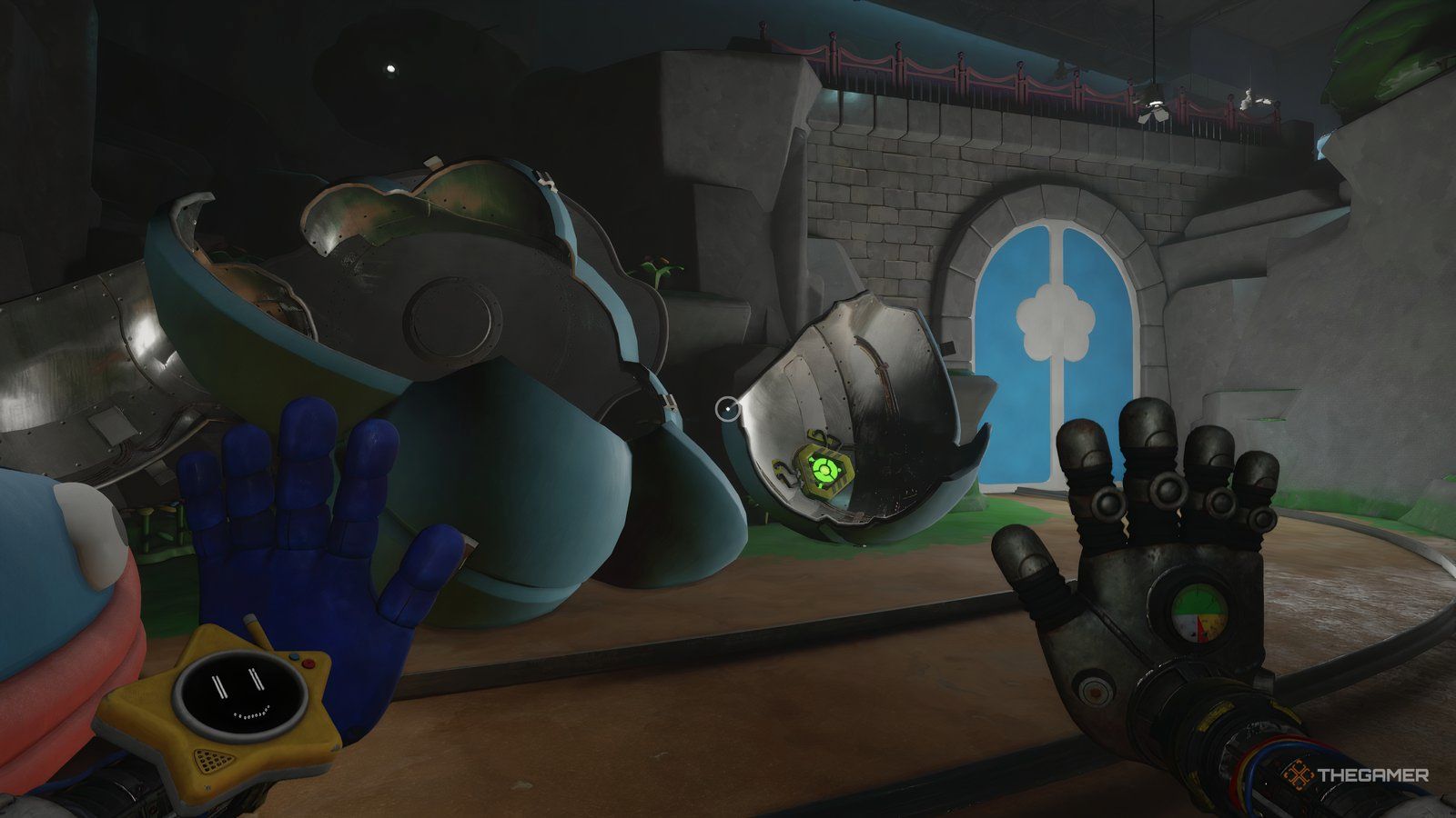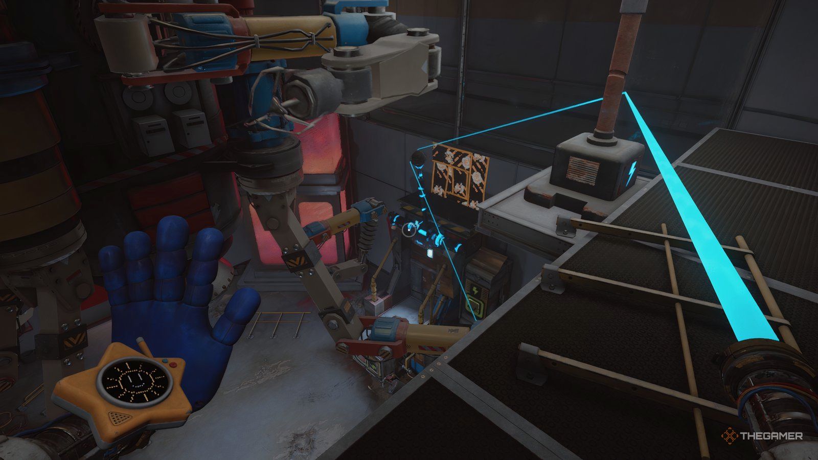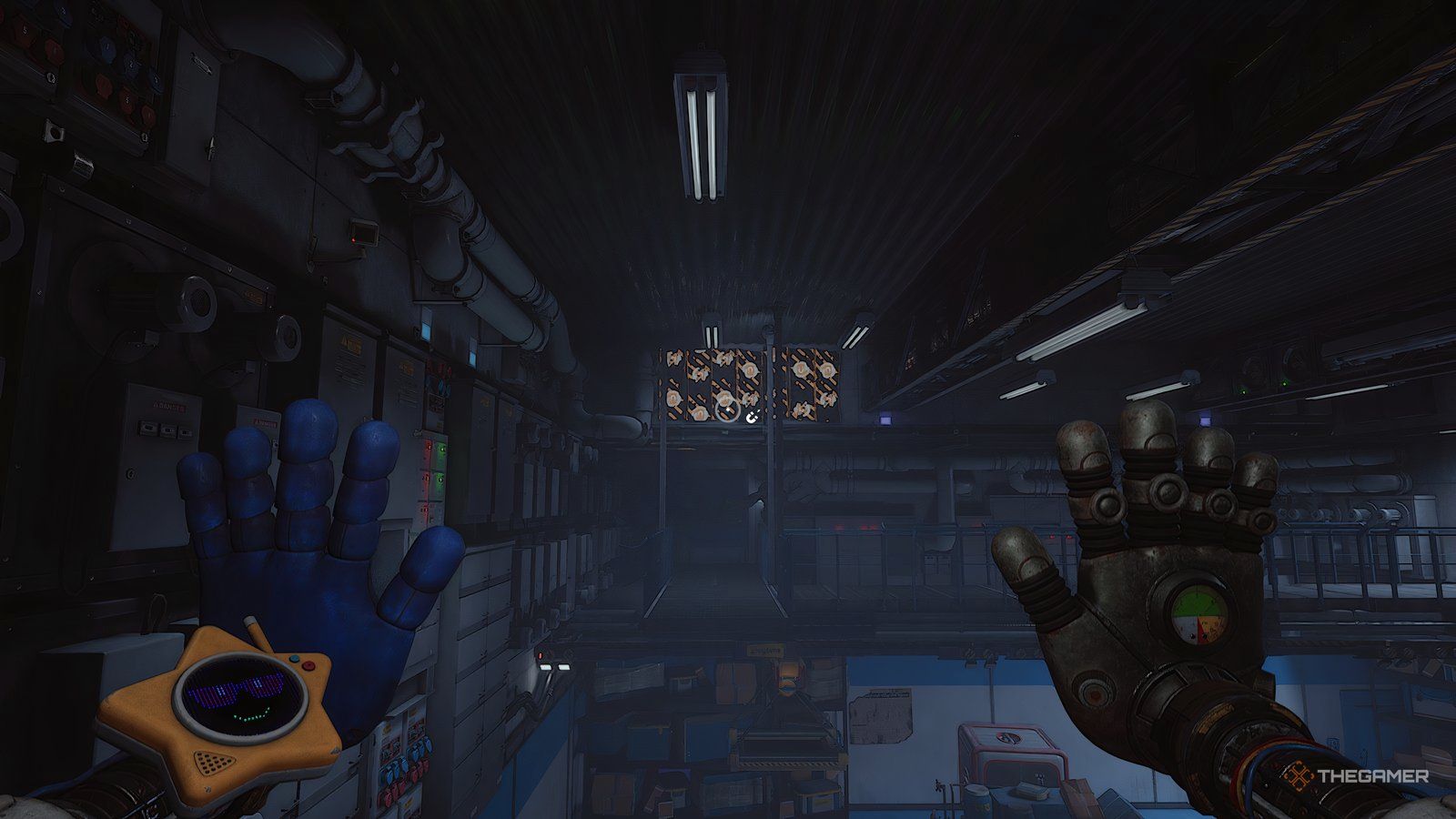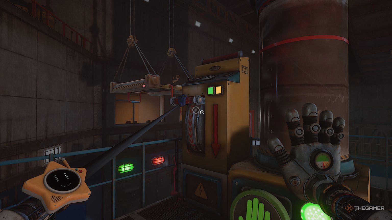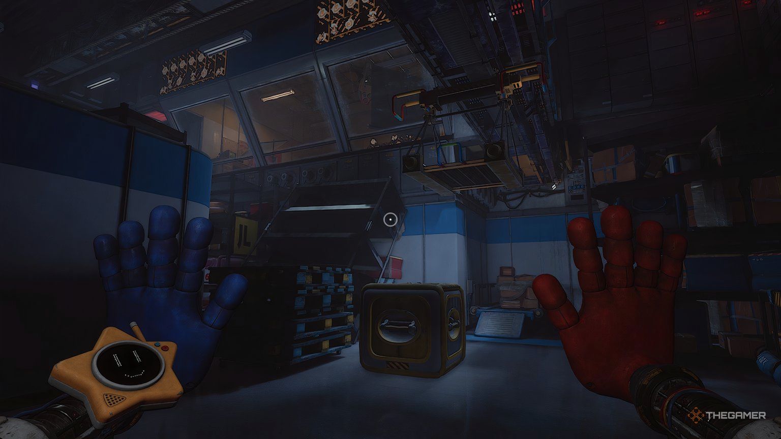 Как только вы войдете в новую область, ваша следующая цель — обыскать инженерную мастерскую. Сначала подойдите к стене прямо напротив входа и посмотрите за одной из тележек, чтобы найти письмо. Затем используйте свою синюю руку, чтобы переместить потолочный механизм так, чтобы он находился над поддонами, блокирующими ваш путь.