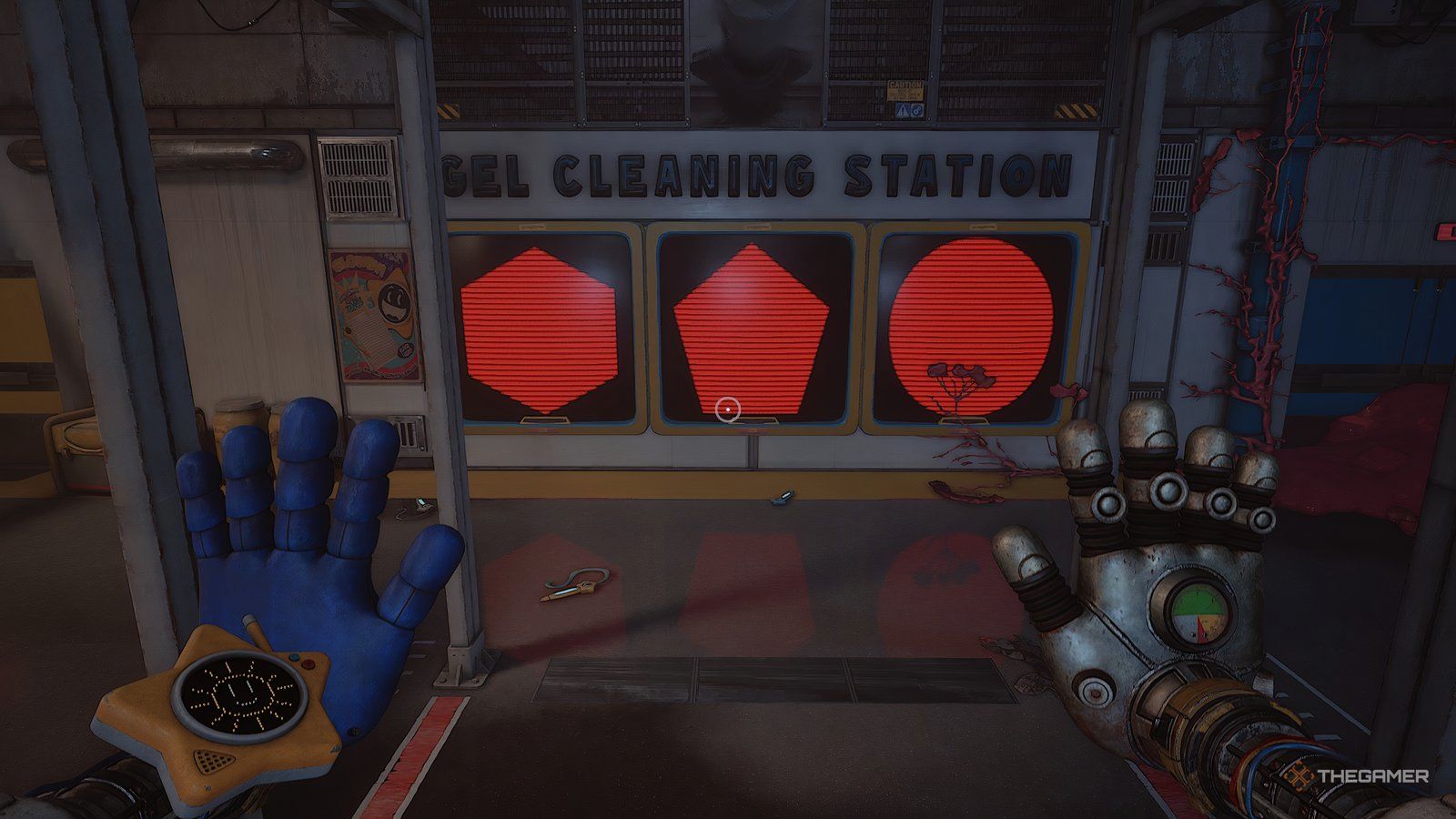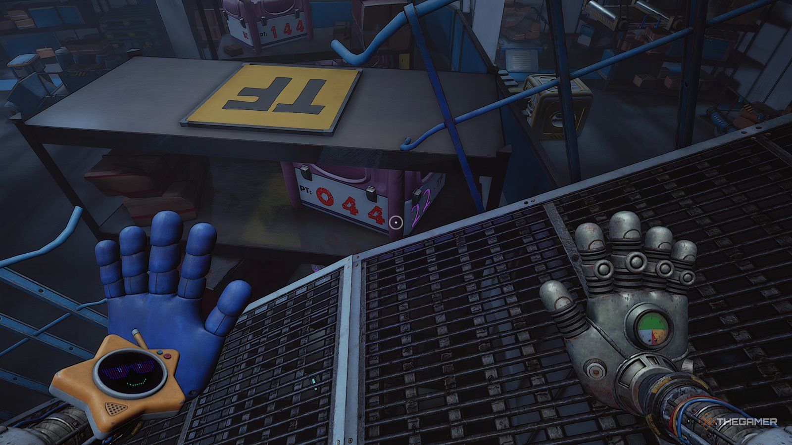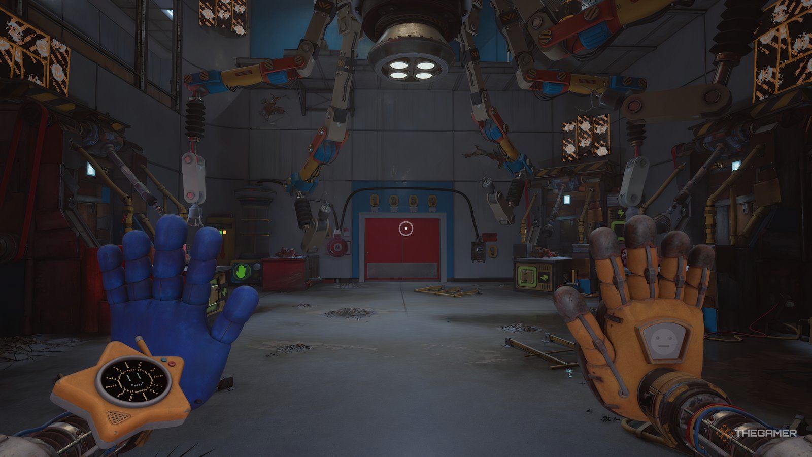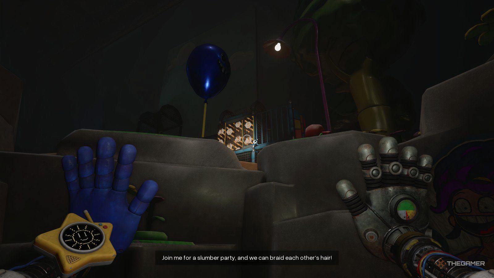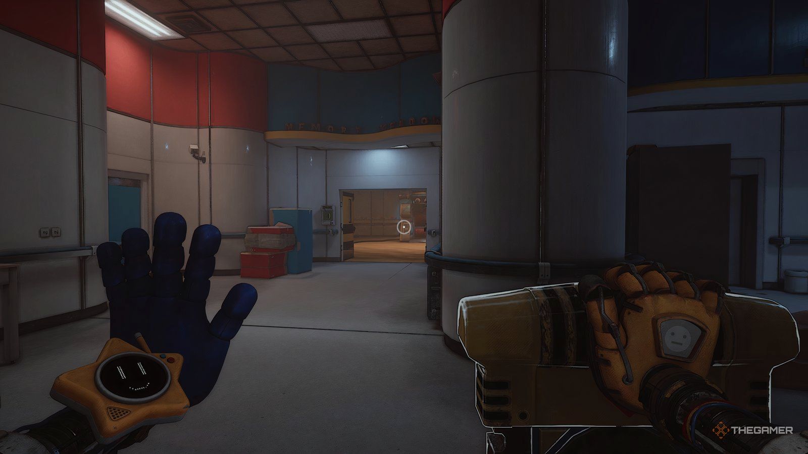 Как только вы войдете в новую область, ваша следующая цель — обыскать инженерную мастерскую. Сначала подойдите к стене прямо напротив входа и посмотрите за одной из тележек, чтобы найти письмо. Затем используйте свою синюю руку, чтобы переместить потолочный механизм так, чтобы он находился над поддонами, блокирующими ваш путь.