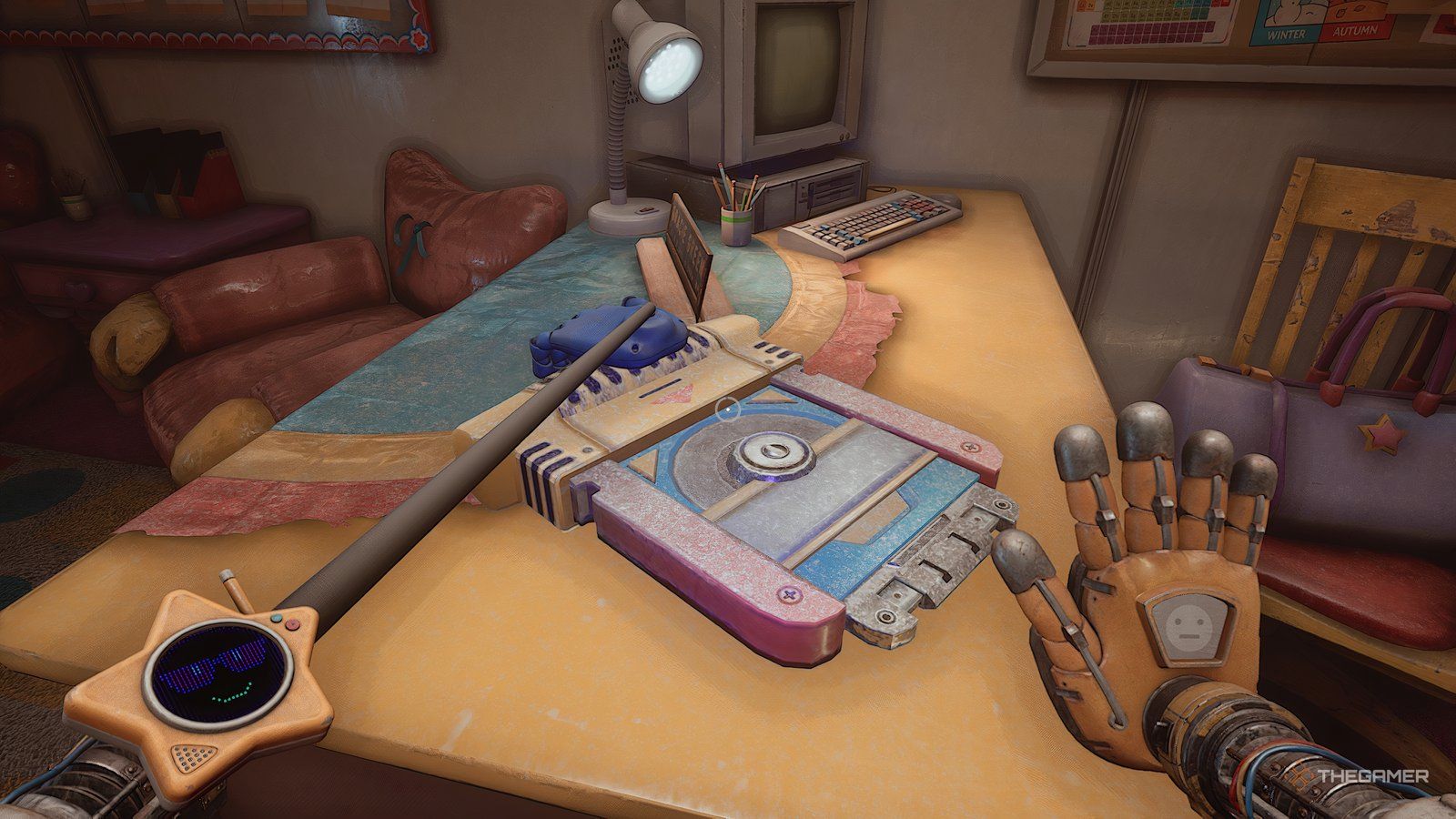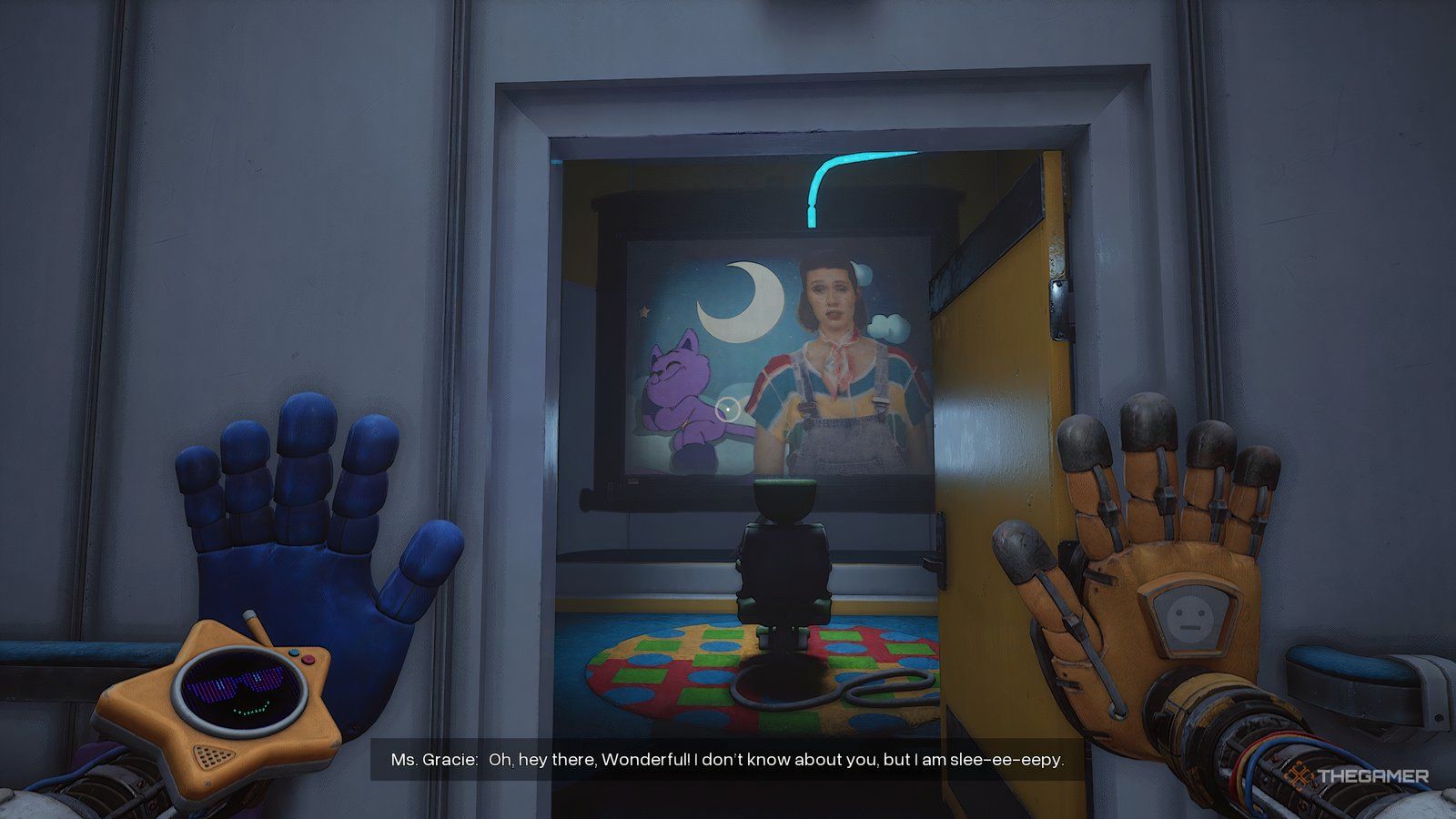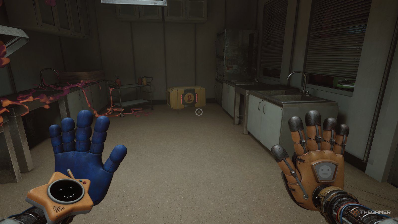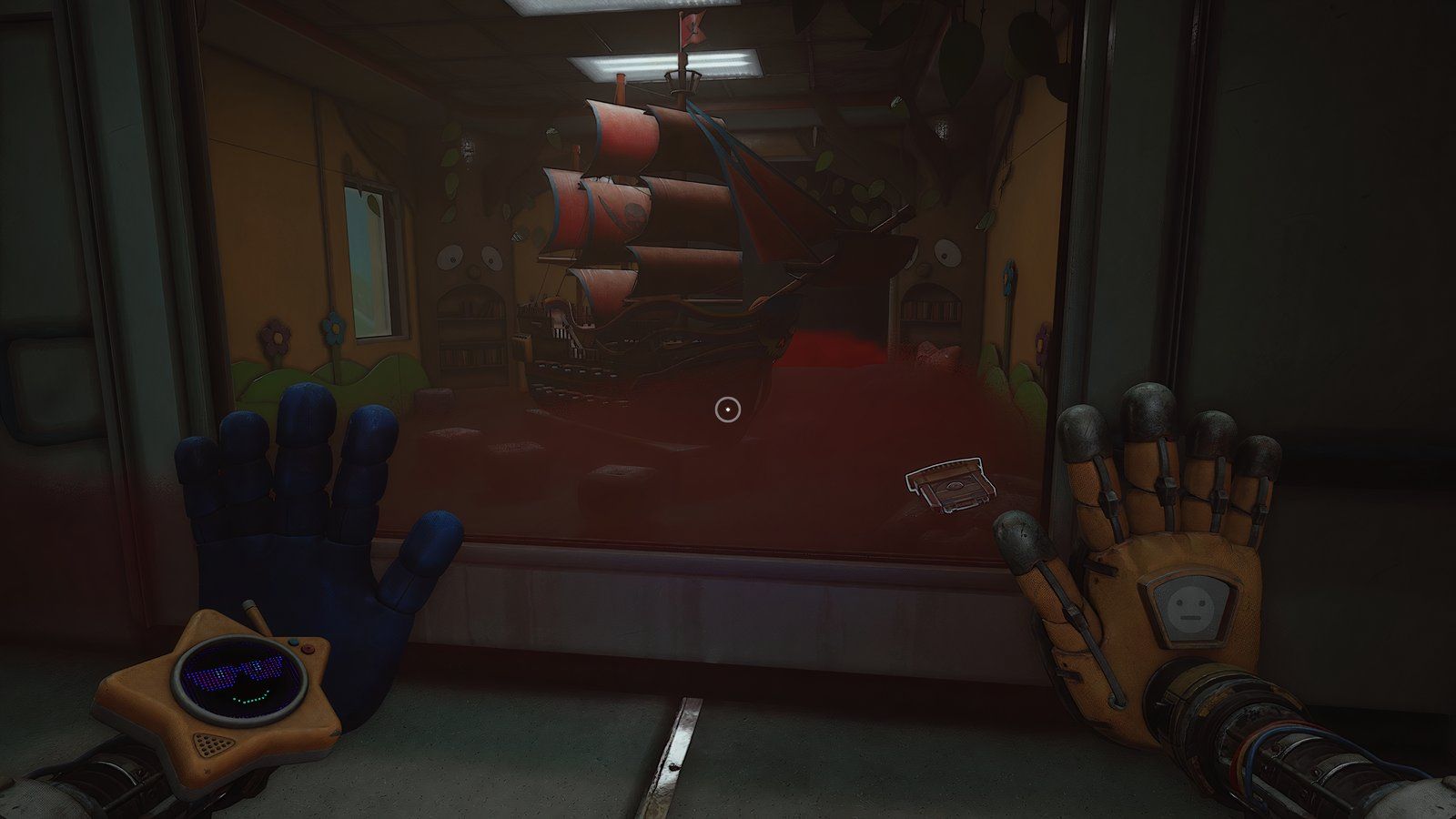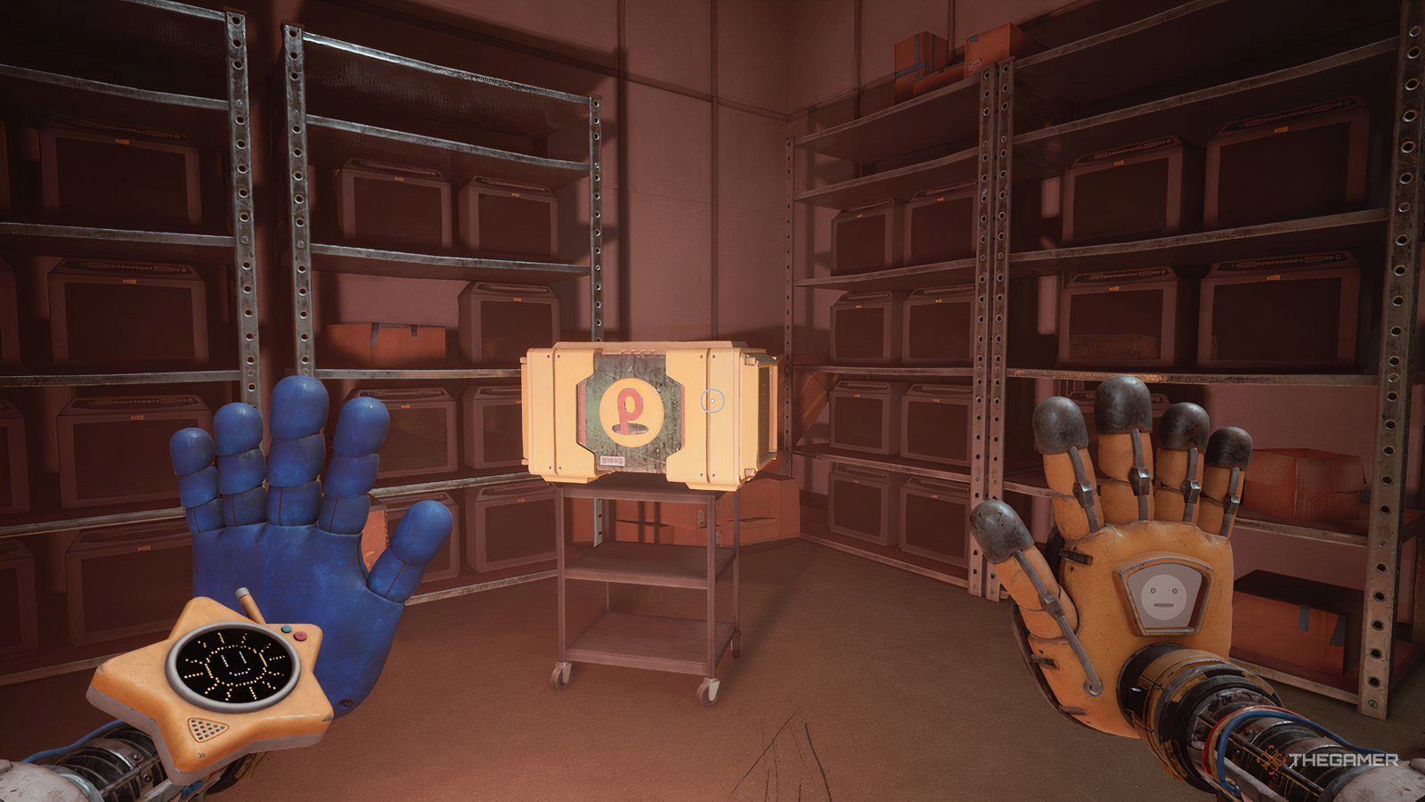 Как только вы войдете в новую область, ваша следующая цель — обыскать инженерную мастерскую. Сначала подойдите к стене прямо напротив входа и посмотрите за одной из тележек, чтобы найти письмо. Затем используйте свою синюю руку, чтобы переместить потолочный механизм так, чтобы он находился над поддонами, блокирующими ваш путь.