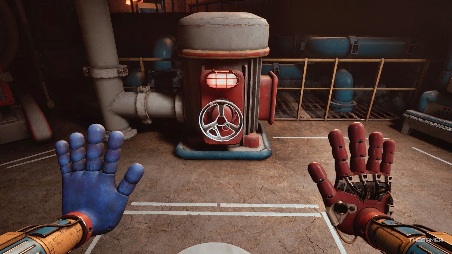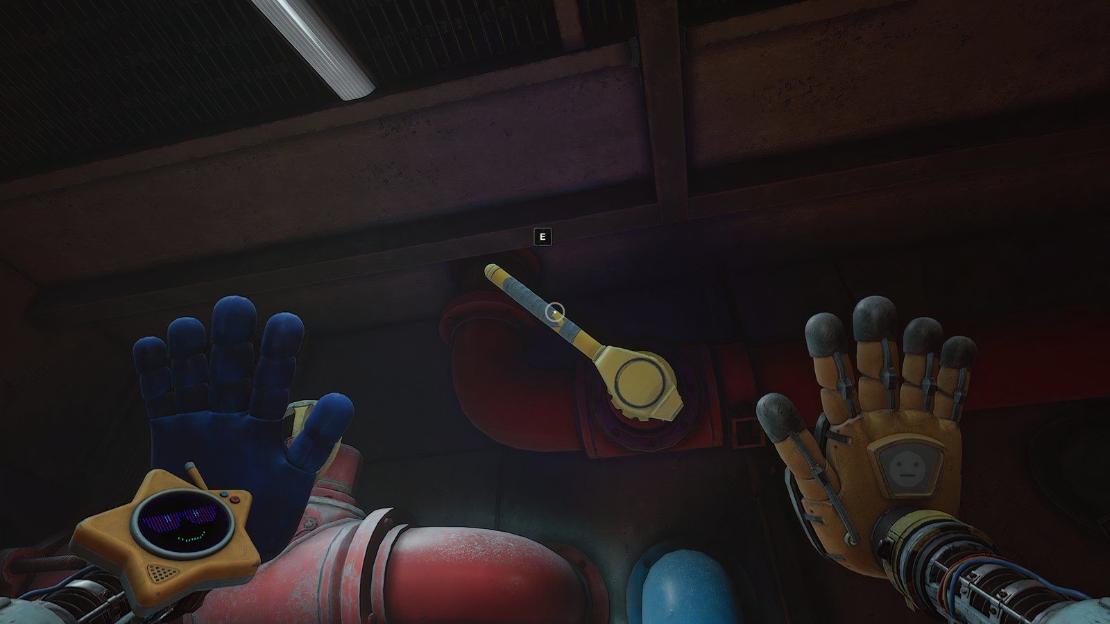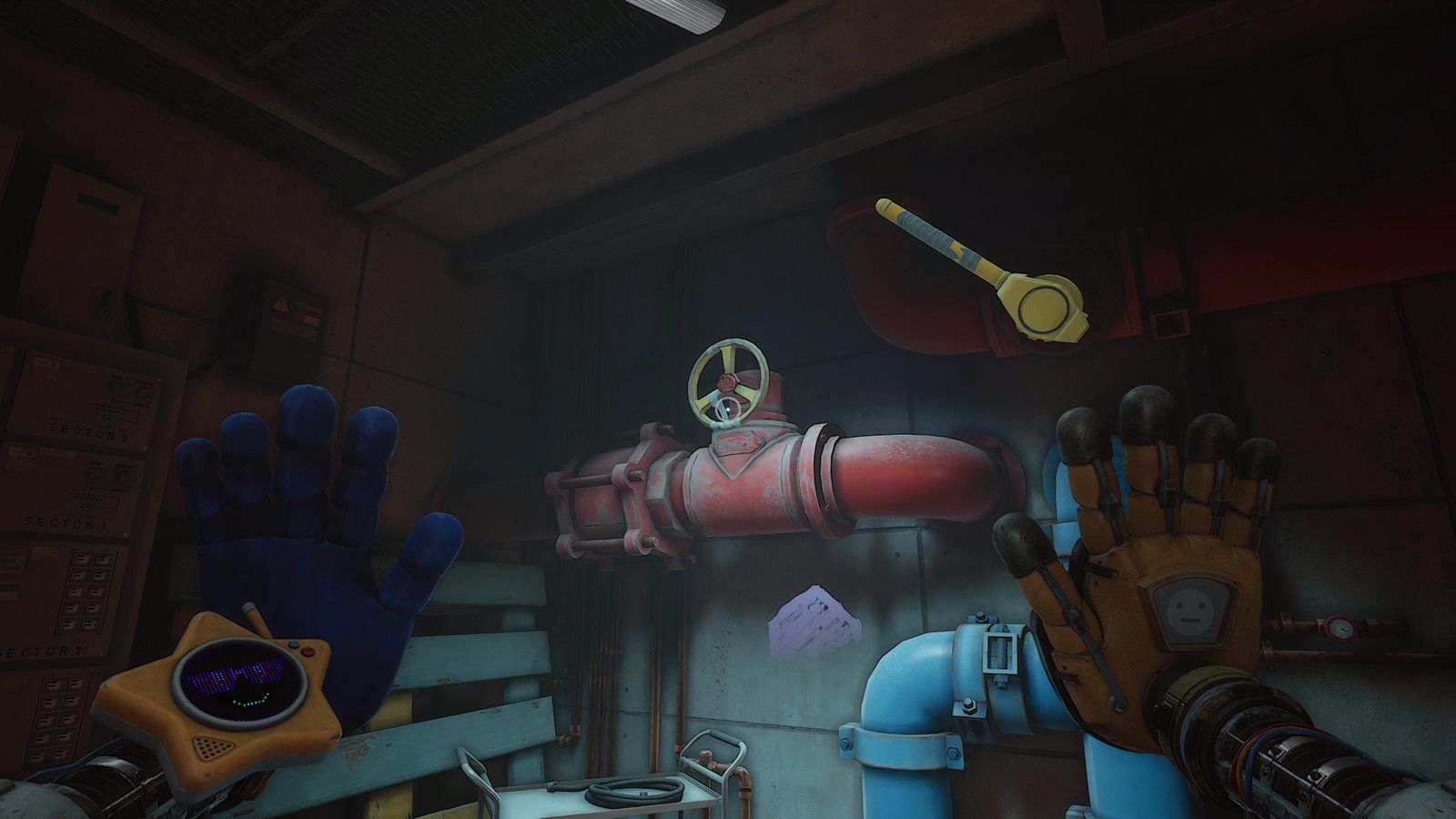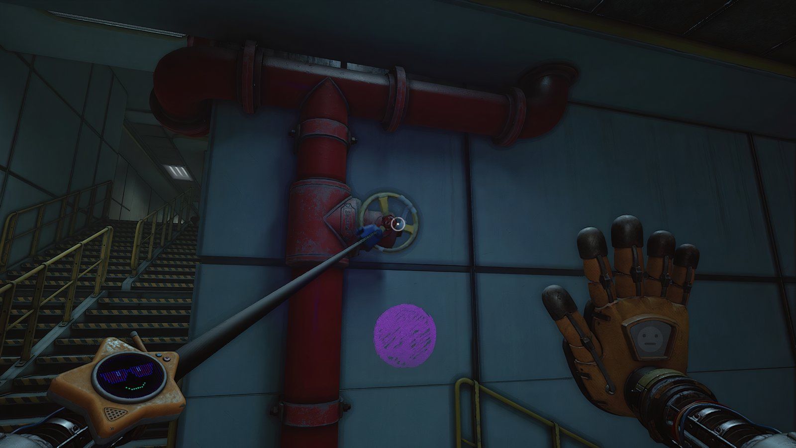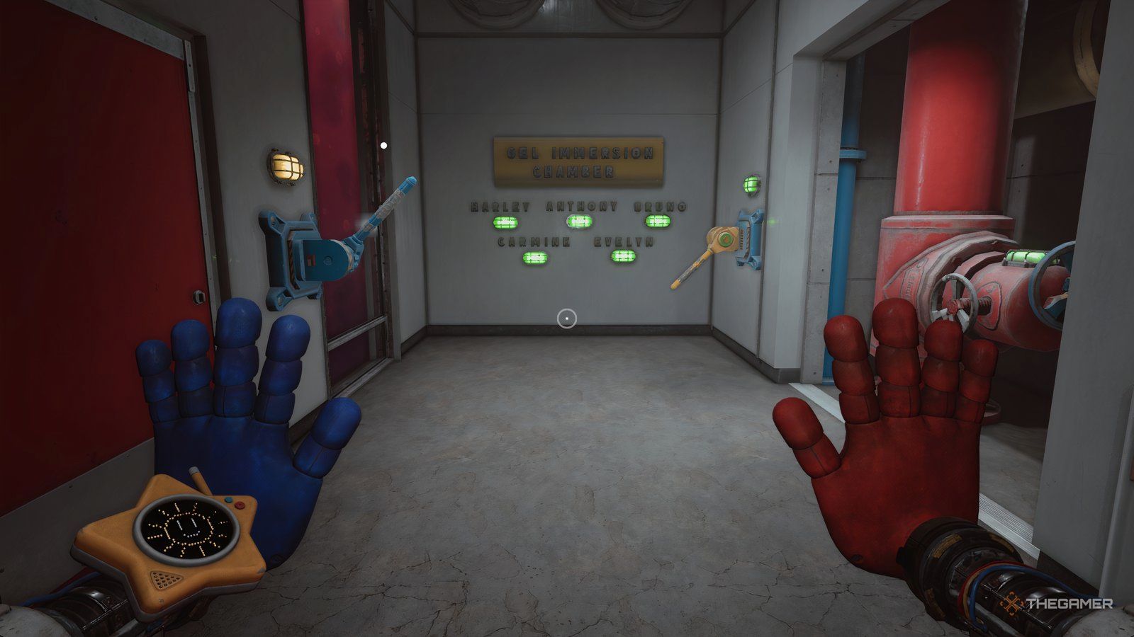 Продолжая держать синюю руку, полностью обернитесь вокруг обеих групп труб в комнате, пока лампочки над другой ручкой не станут синими. Как только они станут синими, используйте свою правую руку, чтобы нажать на ручку.