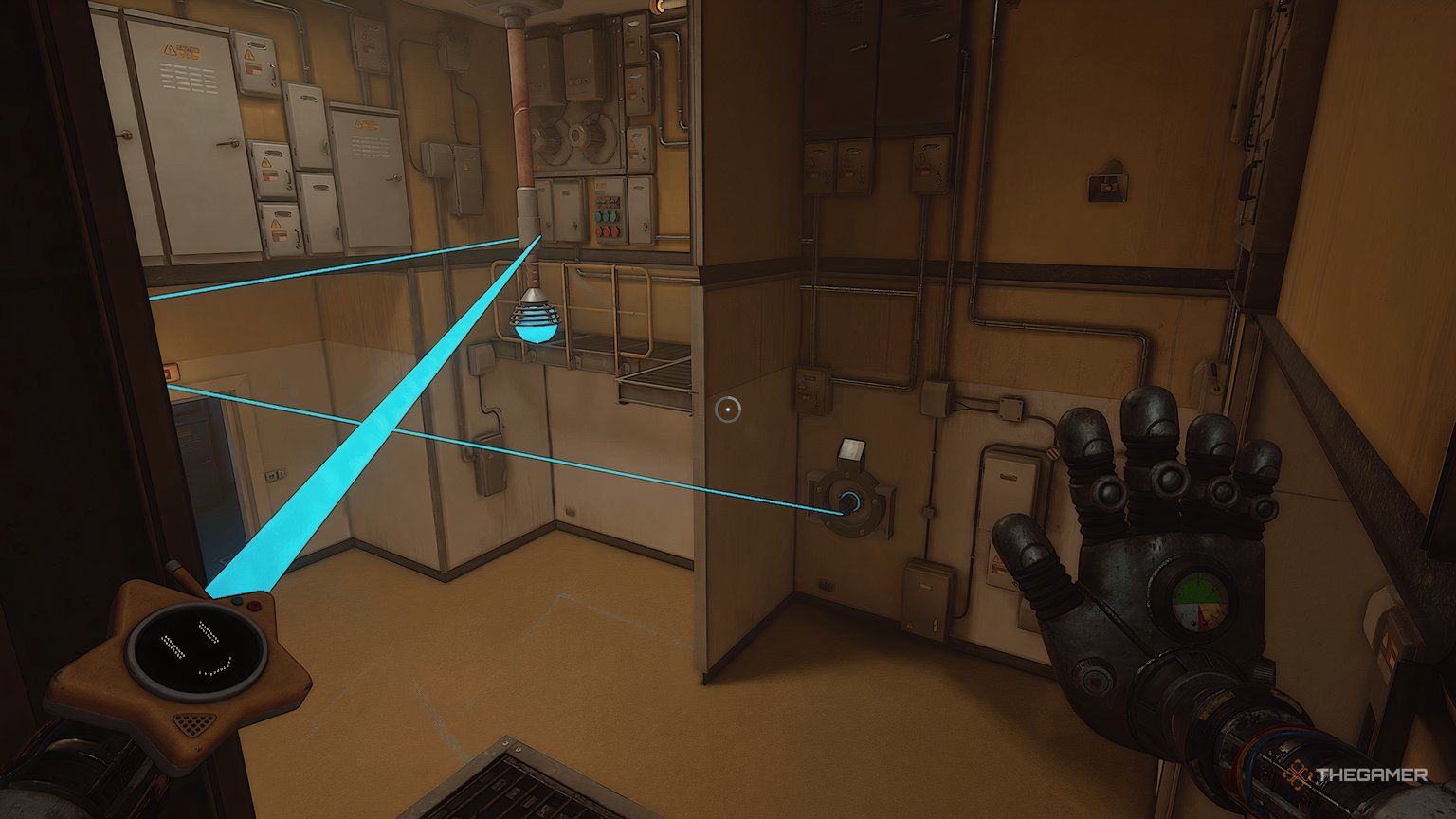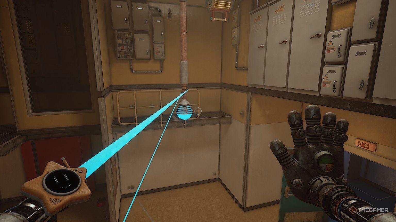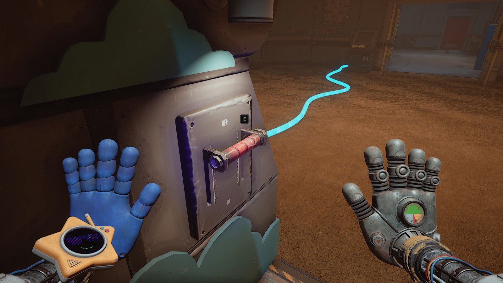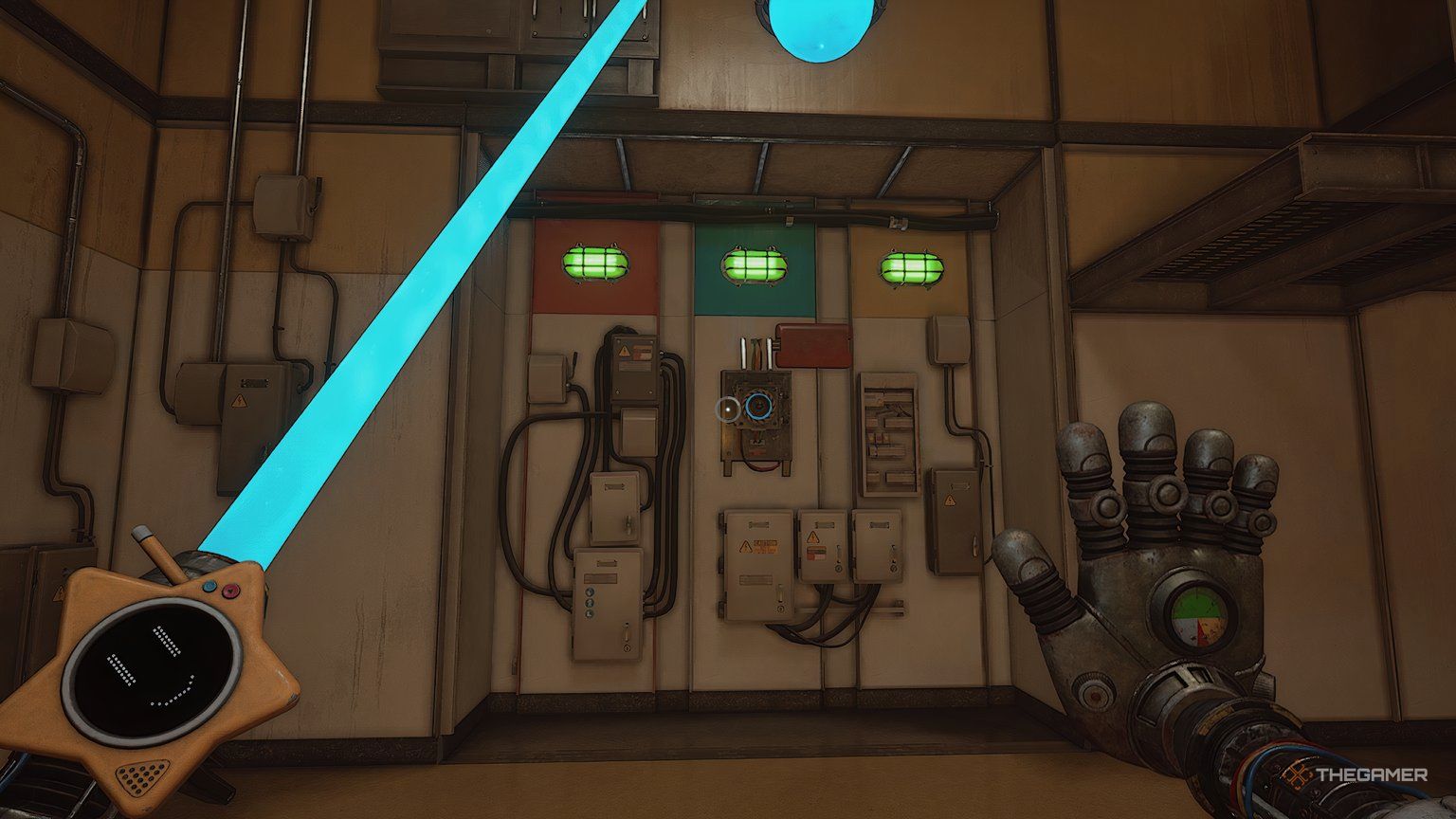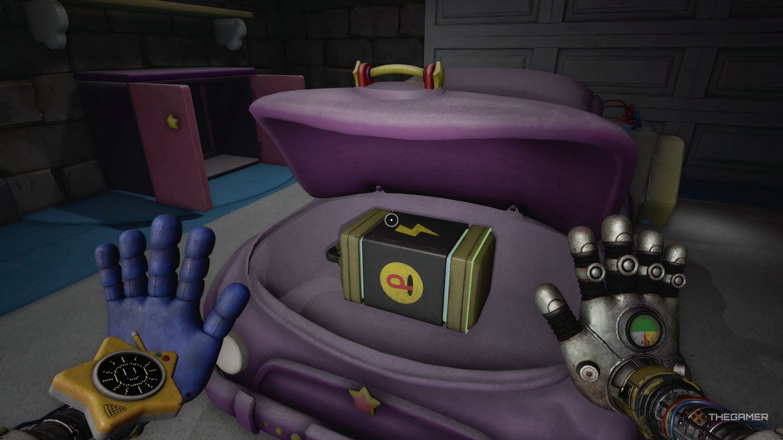 При установленных обеих батареях используйте свою синюю руку, чтобы повернуть ручку, расположенную между ними. Это заставит вашу синюю руку светиться. Теперь используйте свою светящуюся руку, чтобы активировать другую ручку в комнате – удар по ней рукой вызовет её перегрузку.