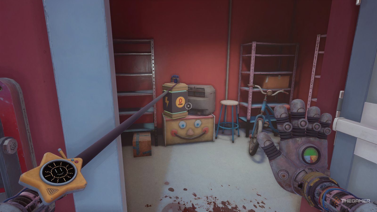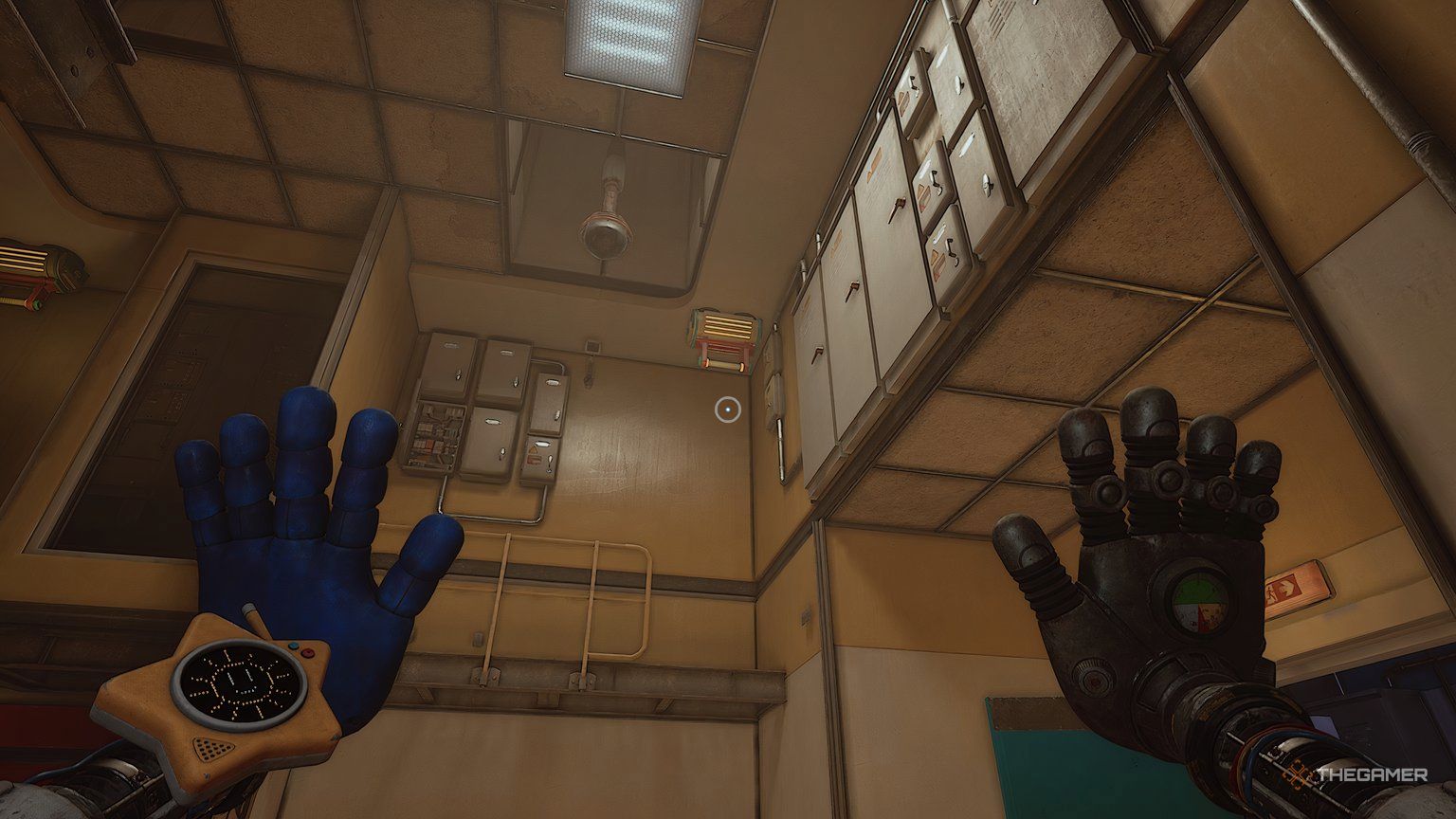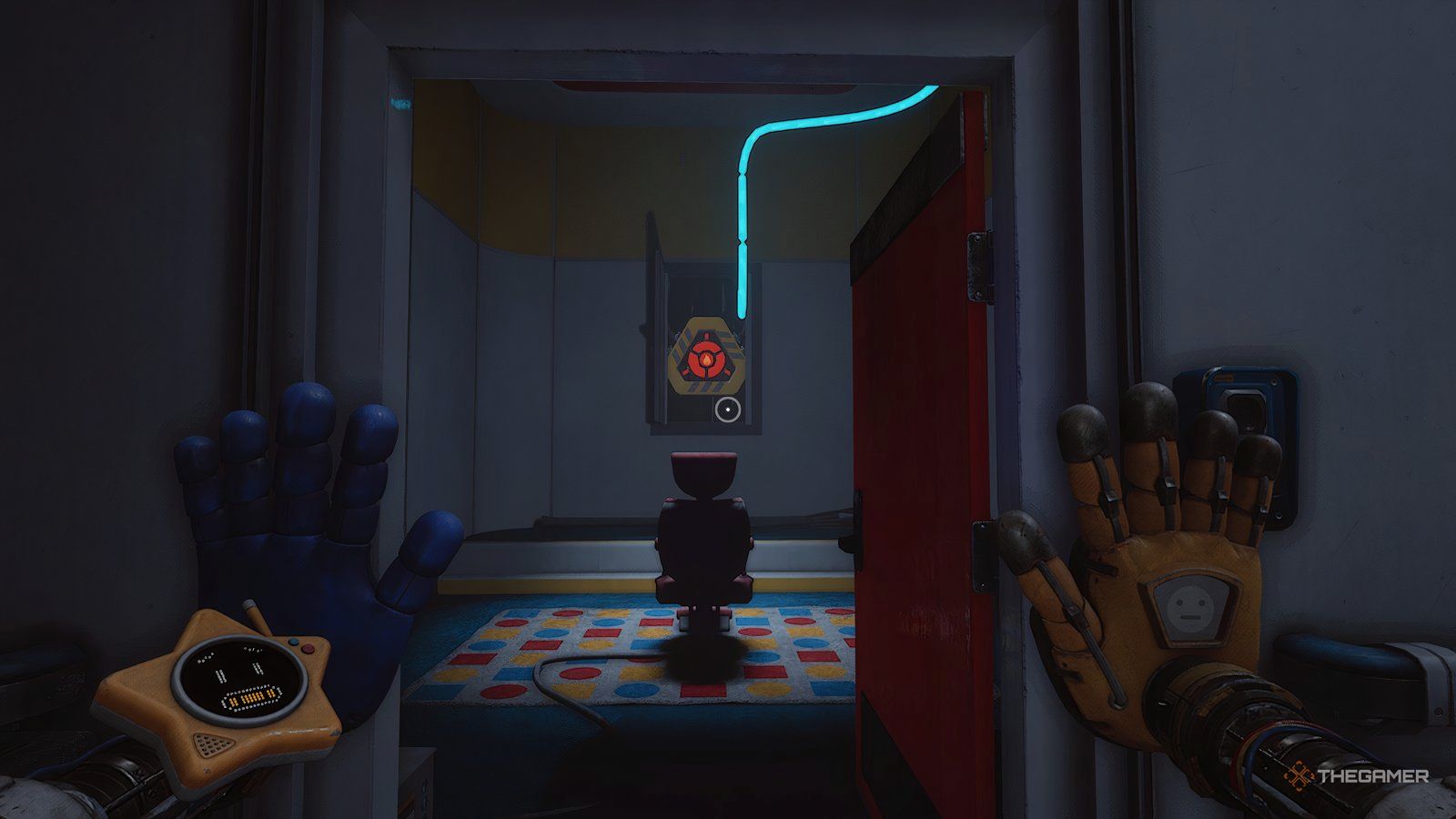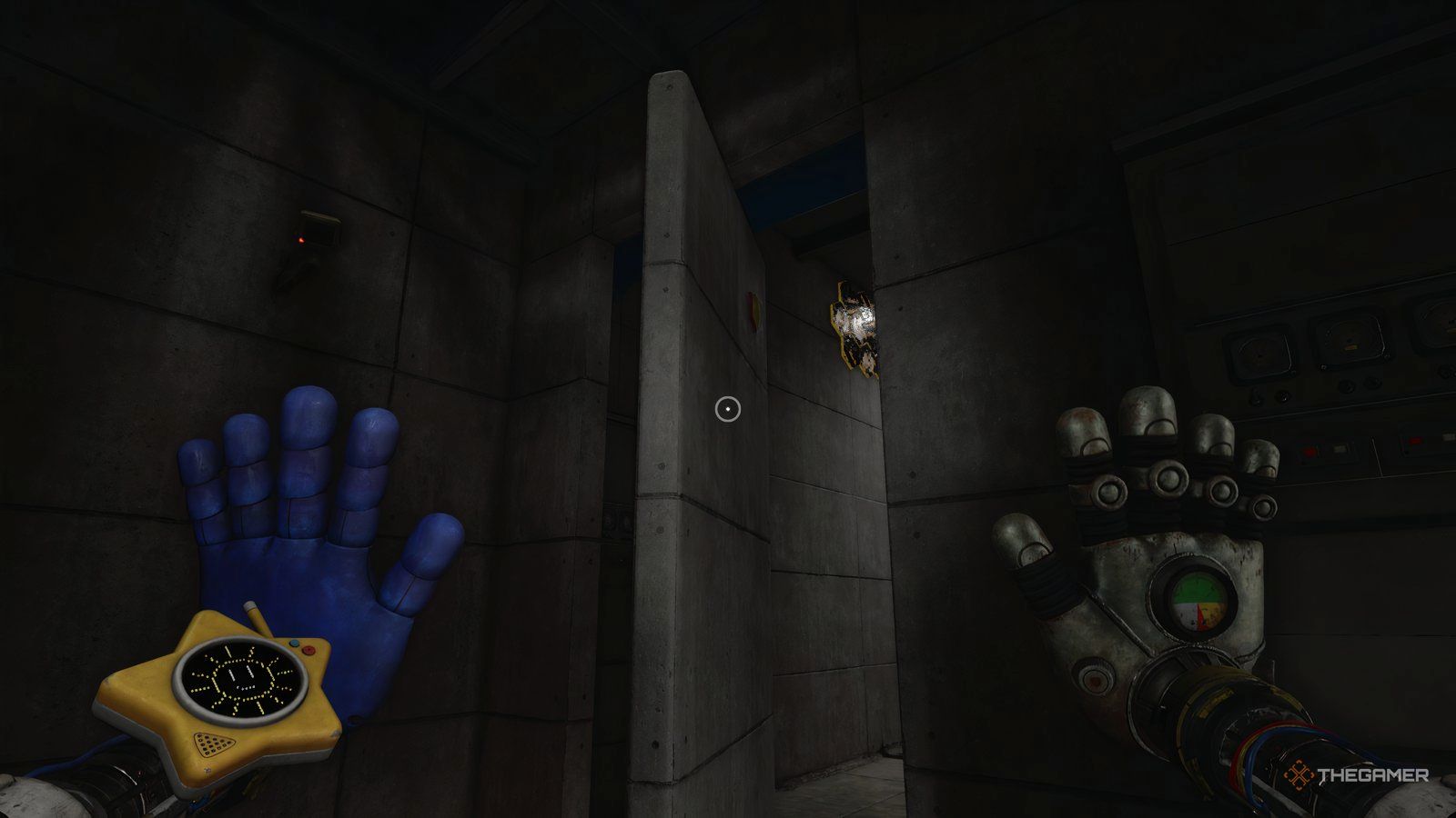 При установленных обеих батареях используйте свою синюю руку, чтобы повернуть ручку, расположенную между ними. Это заставит вашу синюю руку светиться. Теперь используйте свою светящуюся руку, чтобы активировать другую ручку в комнате – удар по ней рукой вызовет её перегрузку.