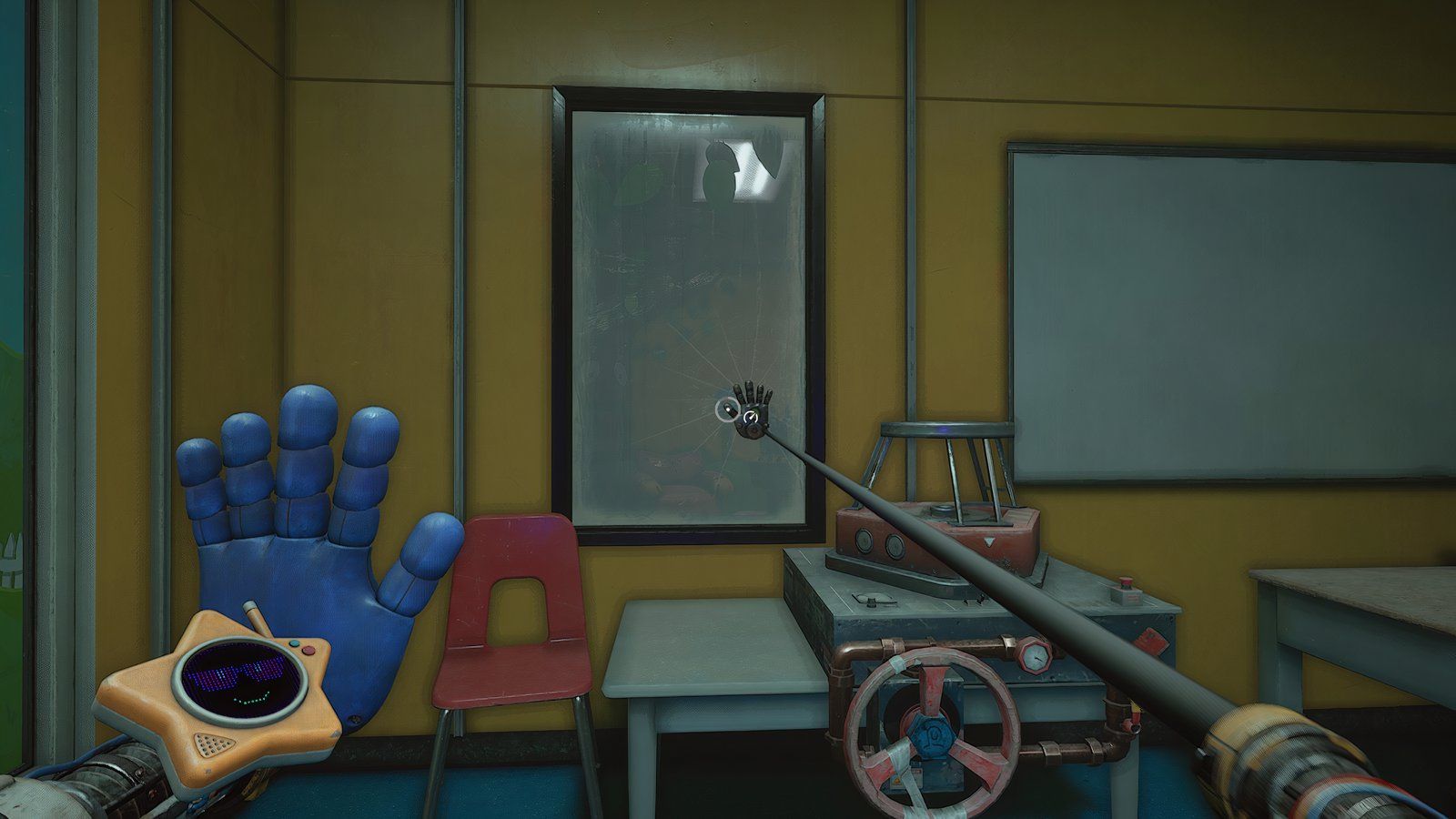 Эта часть не продлится долго. Вы будете сидеть и смотреть видео с Huggy Wuggy, и вам нужно разбить экран рукой. После этого отсоедините стул от стены и используйте ручки рядом с экраном, чтобы поднять себя.
