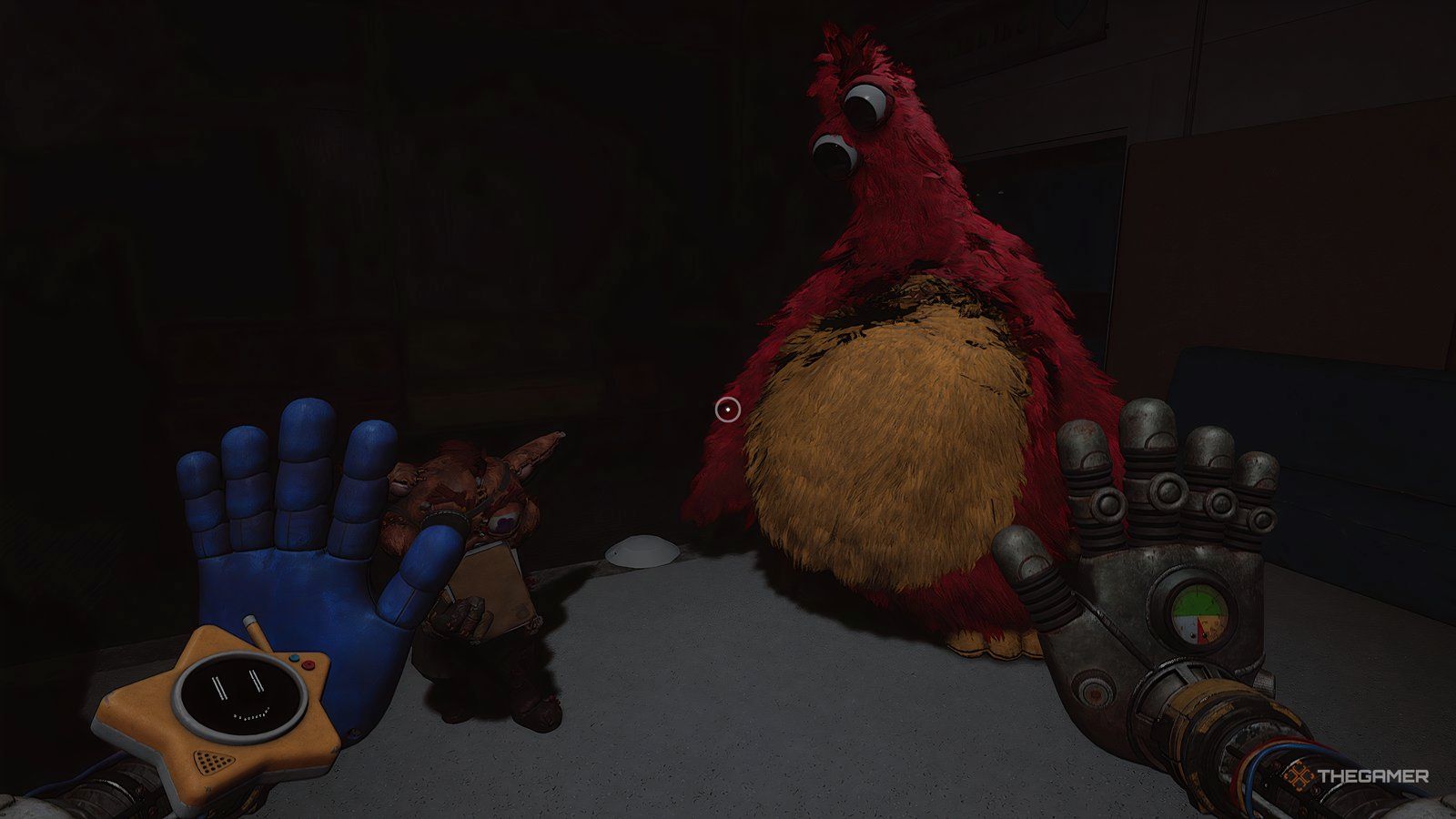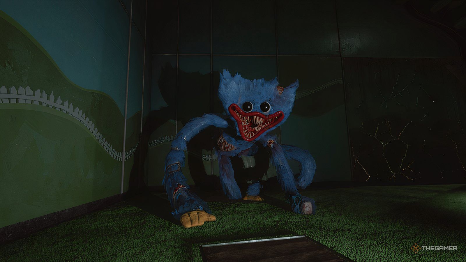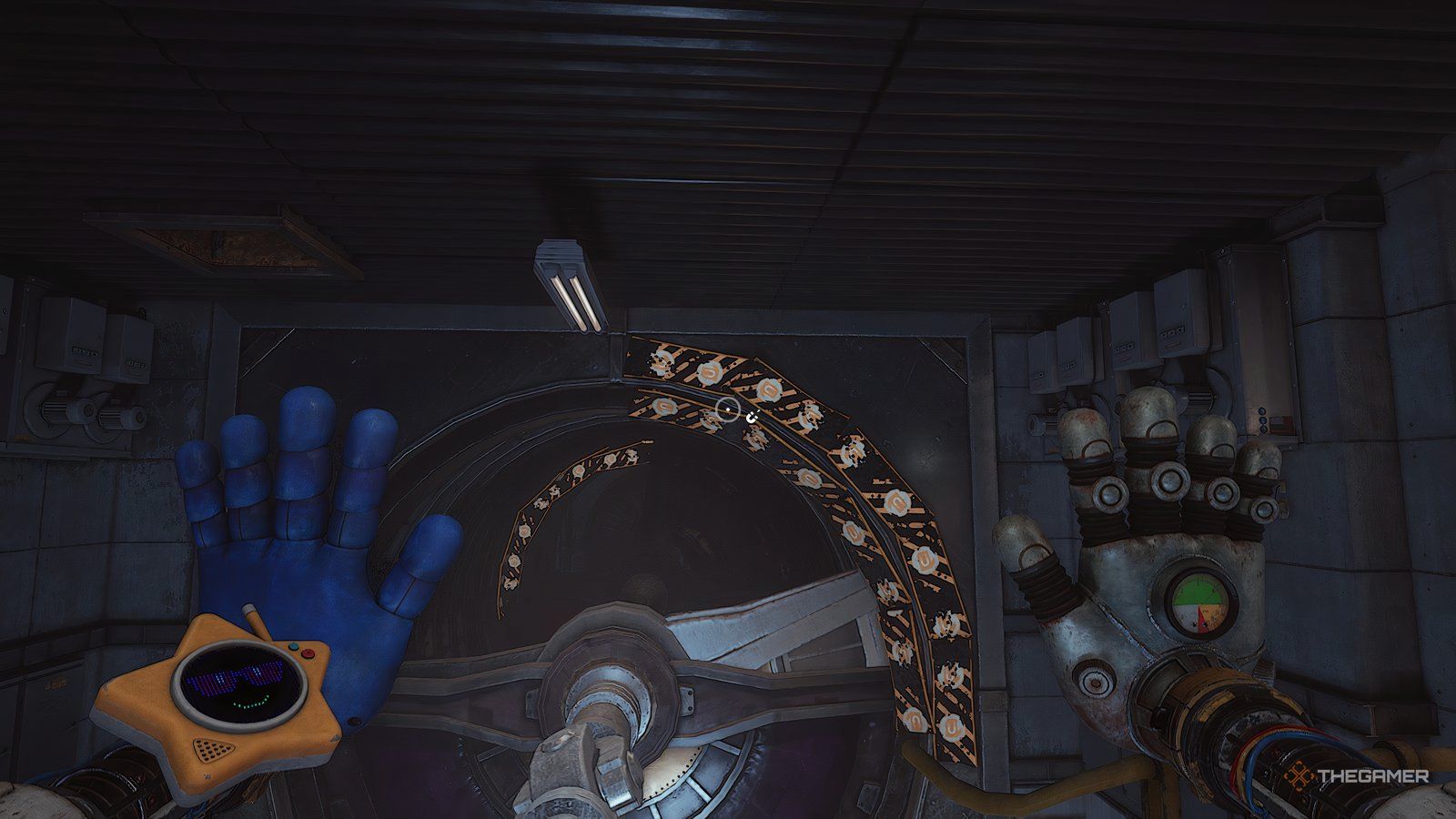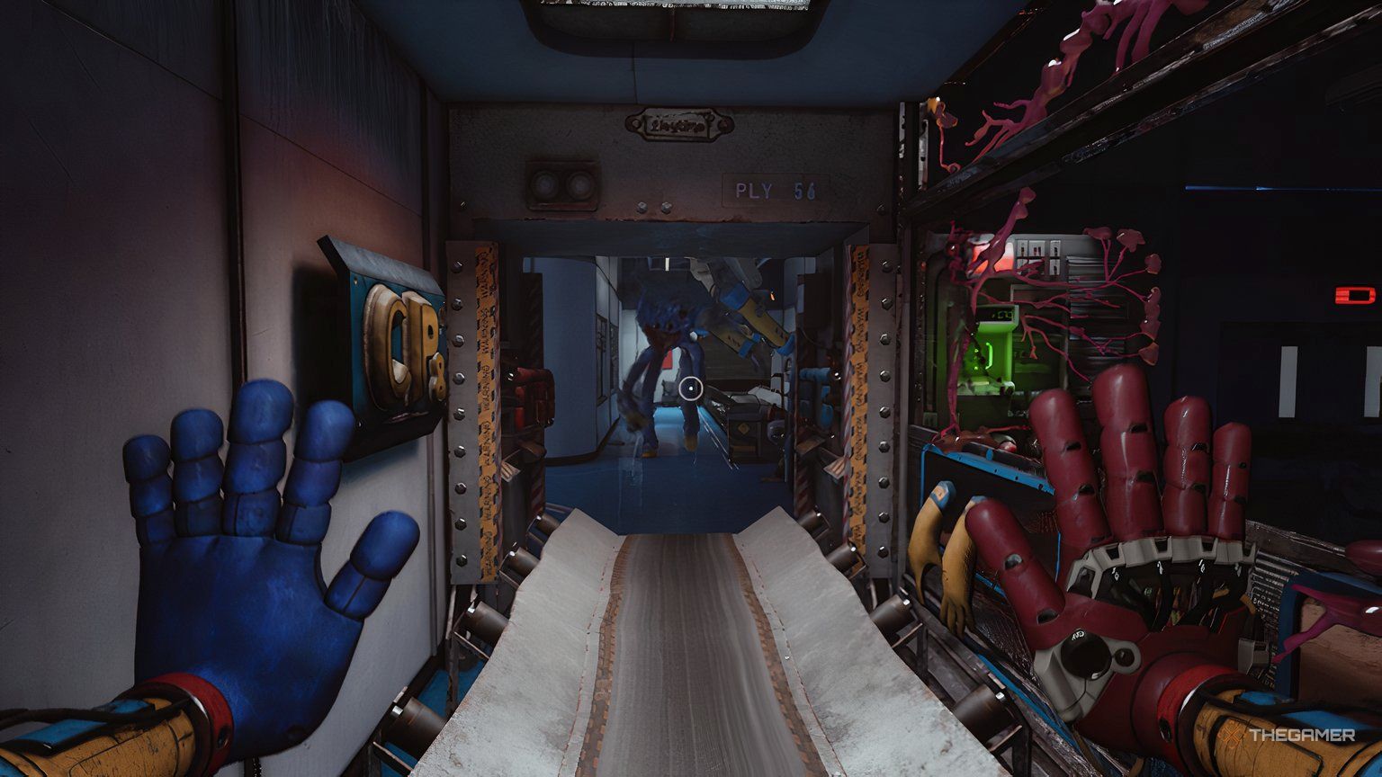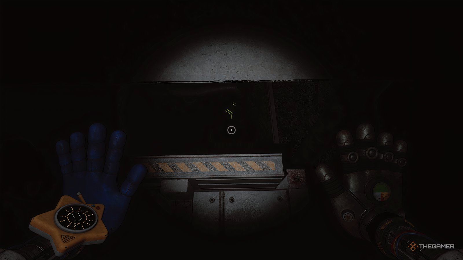 Внутри лифта Хагги Вагги будет пытаться дотянуться до вас, просовывая руки через отверстия в стенах. Вы часто можете увидеть очертания того, где он собирается прорваться, и обычно получаете предупреждение – например, облачко пыли – показывающее, где он появится в следующий раз.