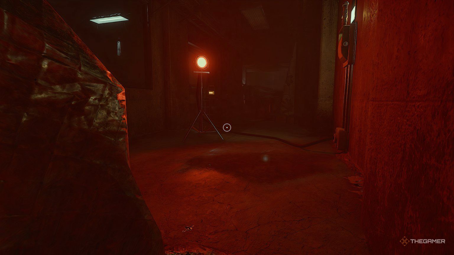 Продолжайте двигаться вперёд, пока не найдёте участок, освещённый ярким красным свечением. Когда вы до него доберётесь, вы увидите рычаг на правой стене. Потяните за рычаг, чтобы активировать освещение, затем повернитесь и пройдите обратно через узкий проход, через который вы ранее ползли. Теперь вы обнаружите открытую дверь справа.