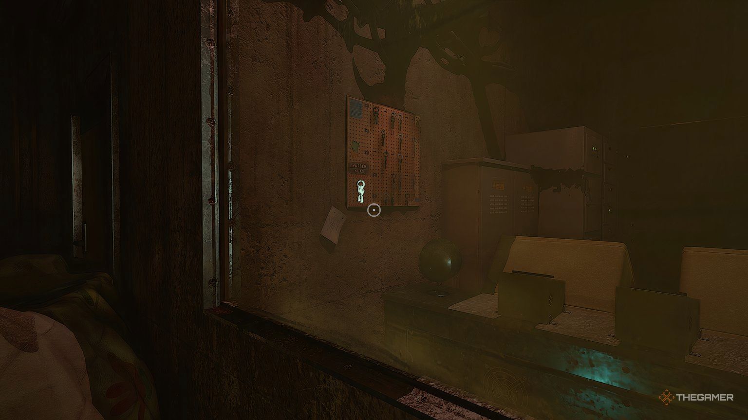Чтобы туда добраться, направляйтесь на противоположную сторону комнаты, оставаясь на верхнем уровне, и подберите висящий ящик. Вы можете перетащить его на другую сторону, а затем использовать его в качестве платформы, чтобы прыгнуть в офис. Переверните доску маркером рукой, а затем посветите ультрафиолетовым фонариком на неё. Введите код, обведенный на доске – 0859 – в шкафчик за вами, и он откроется, демонстрируя новый предмет.