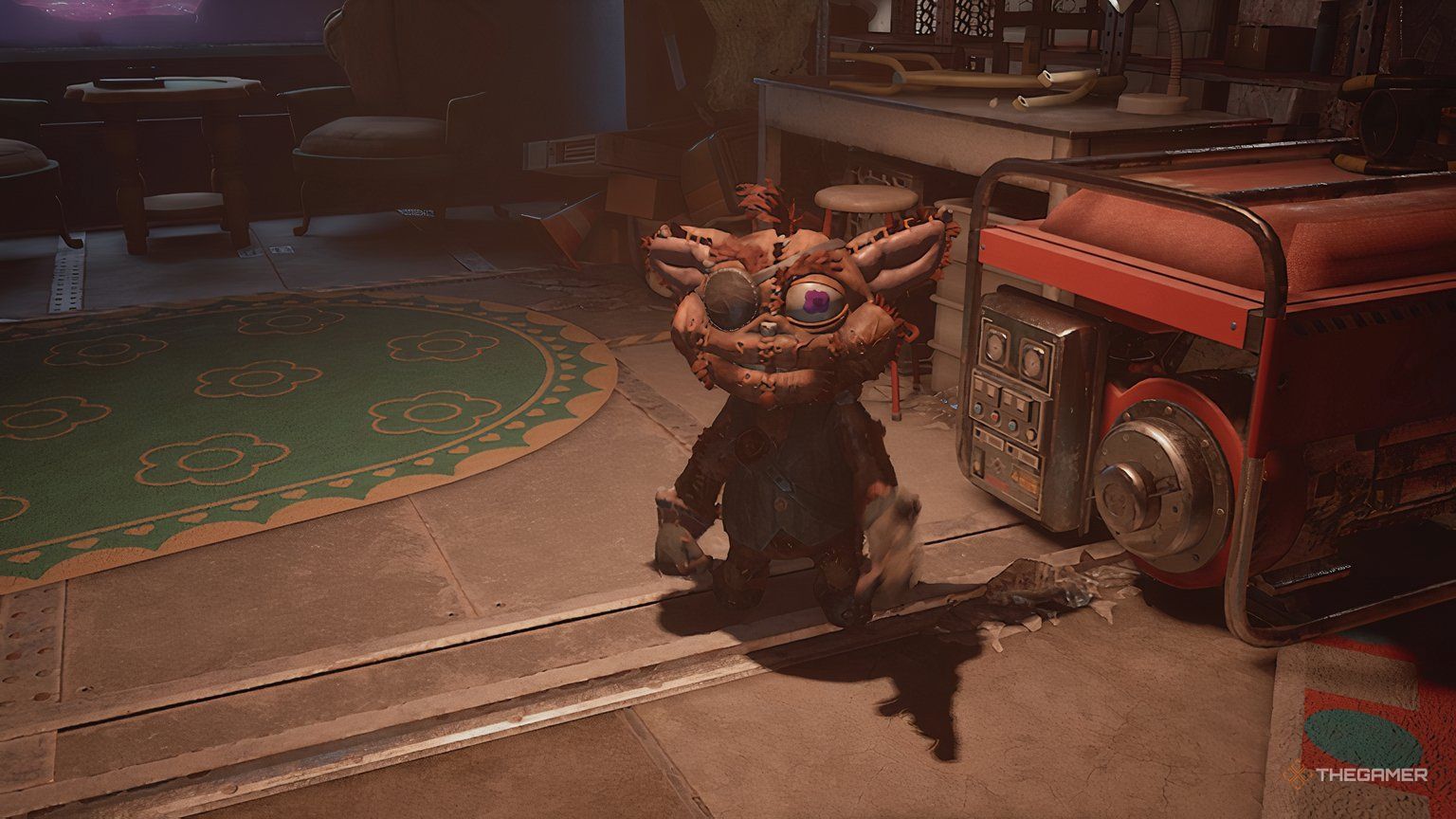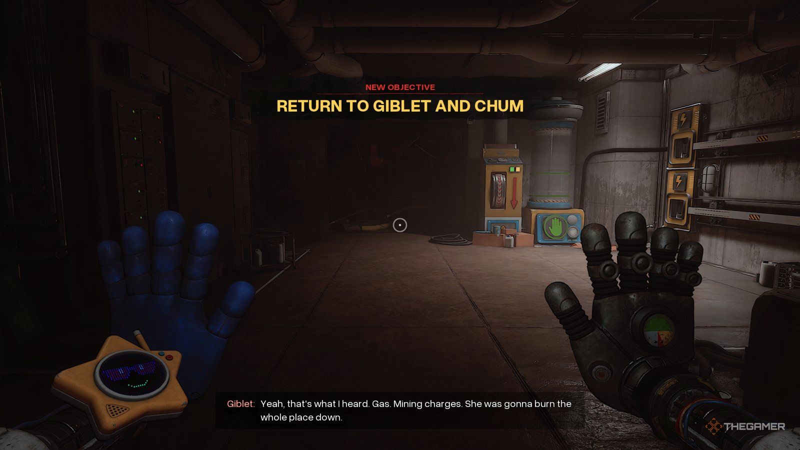 Если все прошло успешно, вы увидите пламя, выходящее из вентиляционного отверстия, через которое вы пришли, и дверь под ним откроется. Когда вы пройдете через дверь, Chum Chompkins попытается схватить вас, но Giblet вмешается. Оставайтесь с Chum Chompkins и Giblet до тех пор, пока не получите следующую цель: ‘Find Prototype Data’.