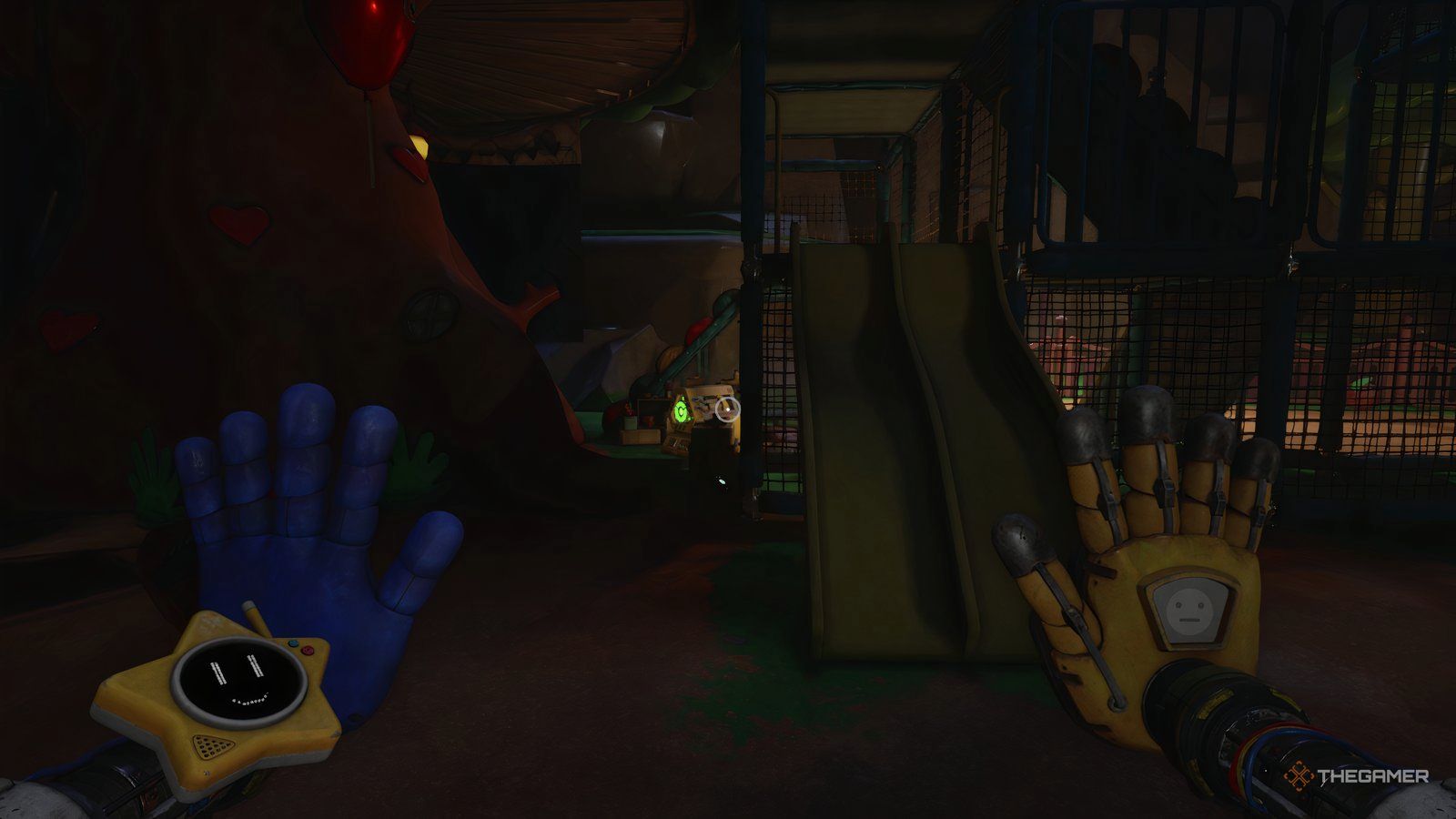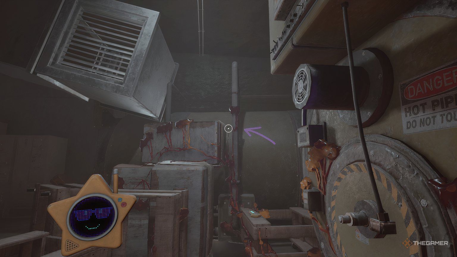 Когда вы дойдете до области с трубами, светящаяся стрелка укажет вам на несколько коробок и вентиляционную решетку слева. Однако, прежде чем идти туда, направляйтесь направо. Вы обойдете небольшую область, где сможете найти плюшевую игрушку Goober GUTZ Outimal на тележке, блокирующей путь. Получив её, вернитесь к трубам и пройдите через вентиляционную решетку.