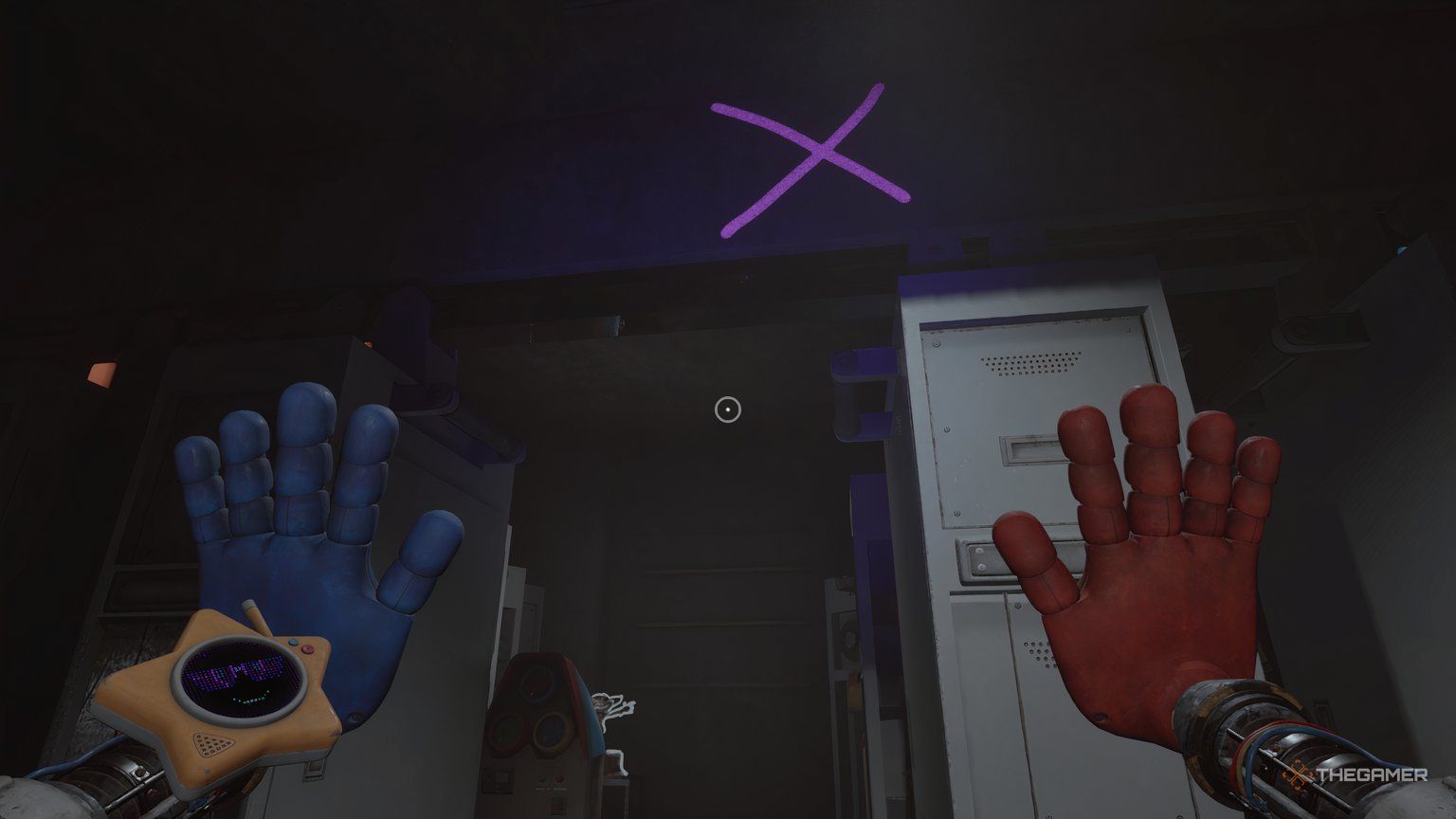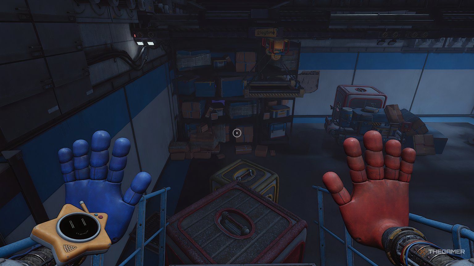 Проползите по вентиляционному отверстию рядом с игрушками. Когда спрыгнете, проверьте край ящиков внизу на предмет кассеты. Спрыгните с ящиков и пройдите через ближайшие двери. Продолжайте двигаться вперед, пока не увидите сканеры для красной и синей рук, расположенные по обе стороны от двери. Отсканируйте обе руки, затем пройдите через дверь.