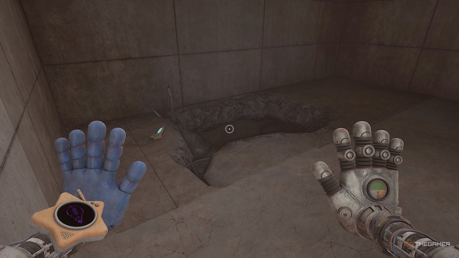 Сканируйте свою руку, чтобы открыть ворота и двигаться вперед. Когда вы дойдете до развилки, поверните направо и продолжайте движение. В конце концов, вы достигнете участка с вентиляционными отверстиями – вам нужно будет присесть, чтобы пройти. Это приведет вас к отверстию в полу, которое сбросит вас в новую область.
