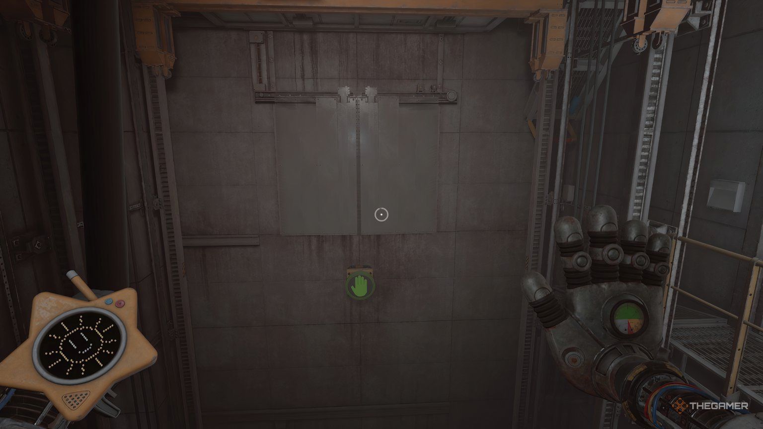 Как только вы сможете двигаться, повернитесь и вернитесь к первому клапану. Вы заметите большое отверстие в стене, через которое можно пройти. Продолжайте бежать по коридору, и вы найдете открытый лифт слева. Зайдите внутрь, и двери автоматически закроются.