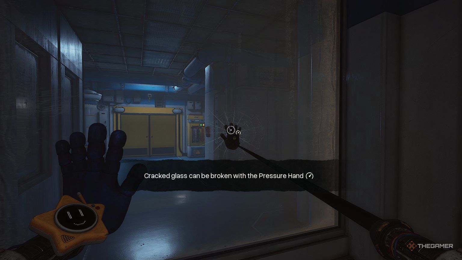 Продолжайте двигаться по пути, пока не найдёте сканер руки. Будьте осторожны и не заходите слишком далеко вперёд, так как стекло разбито только в одном месте. Займите правильную позицию, чтобы ваша рука прошла через большое отверстие и достигла сканера.