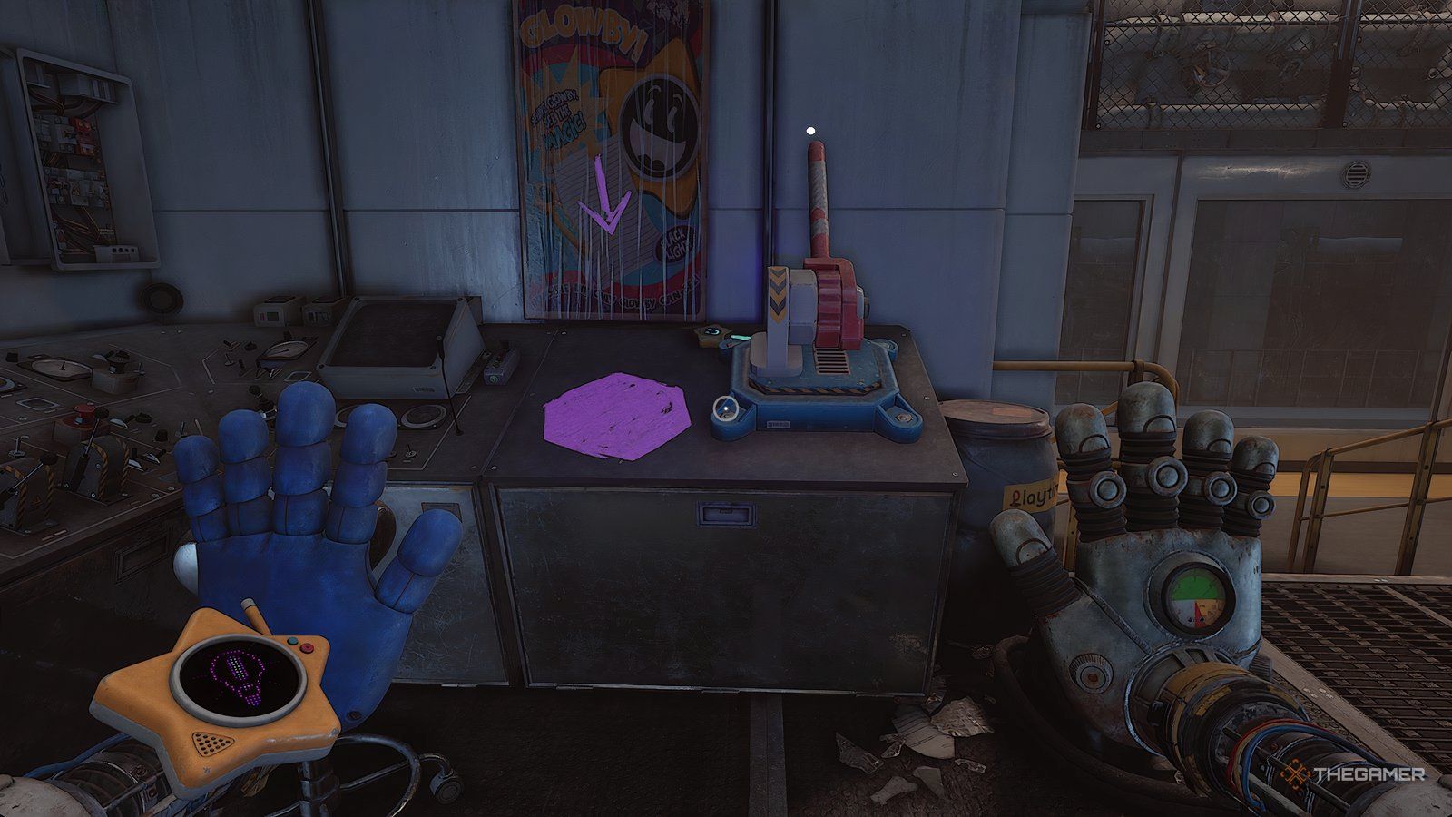 Финальный аккумулятор находится в комнате с небольшим L-образным столом, обращенным наружу. Чтобы попасть внутрь, вам нужно использовать точку захвата на потолке, чтобы подтянуться на крышу офиса. Будьте осторожны — Хагги может достать вас до точки захвата, поэтому это небезопасное место, где можно задержаться. Как только вы окажетесь на крыше, откройте вентиляционную шахту, чтобы спуститься в комнату и найти аккумулятор.