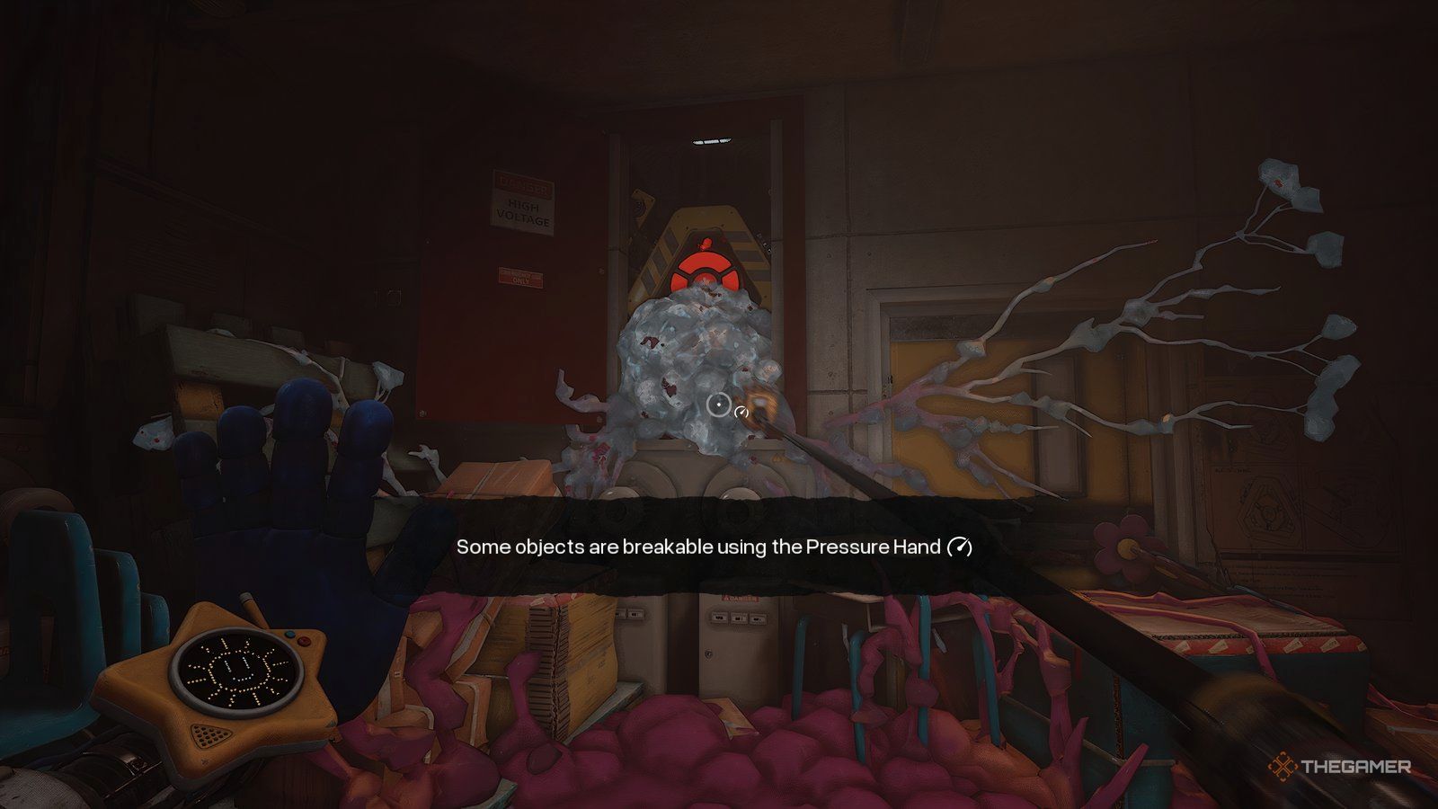 Сначала уничтожьте сгусток и используйте свою Руку Давления, чтобы передвинуть ящик, который преграждает вам путь, но не проходите туда пока. Вместо этого вернитесь наверх по лестнице. Вы найдете вентиляцию в одной из областей, заполненных растениями – до нее можно добраться через разбитое стекло сбоку. Разбейте вентиляцию, затем заберитесь внутрь, чтобы обнаружить секретную комнату.