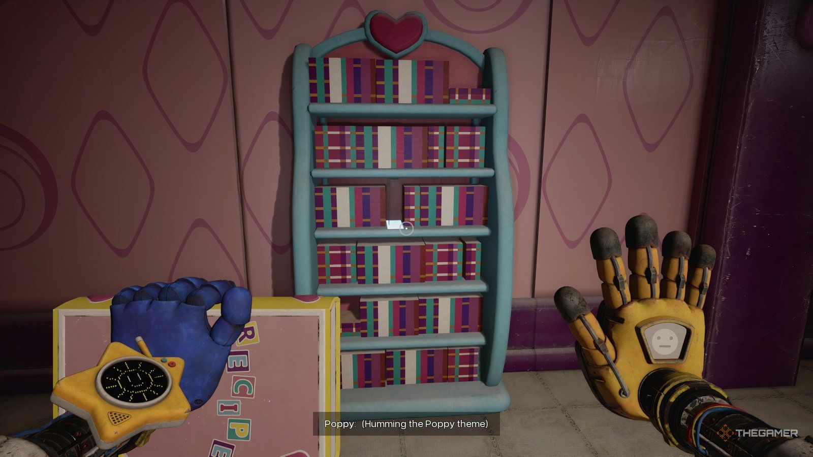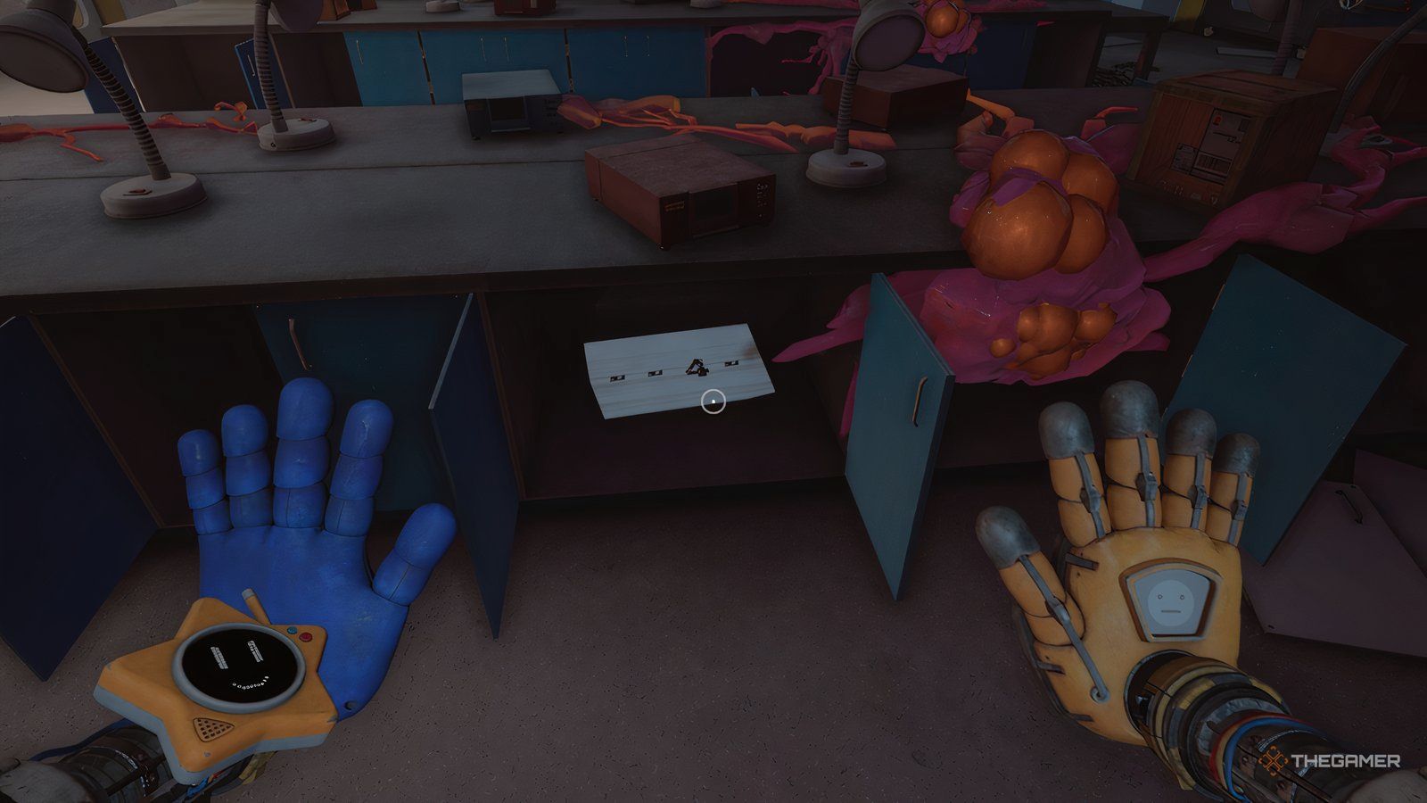 Вы найдёте кассету, ждущую вас на прилавке. Как только вы её возьмёте, пройдите через дверной проём и спуститесь по лестнице. Игнорируйте двери слева и продолжайте идти до конца коридора. Вы увидите свой Grabpack там, но кажется, что-то его ест!