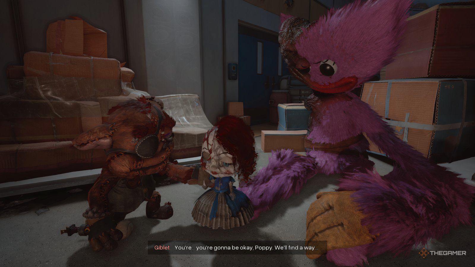 Пройдите через дверь и продолжайте идти, пока Хагги Вагги не найдёт вас. Затем вам придётся убегать от него, пока вы не встретите Кисси, Поппи и Гиблета. У них будет короткое взаимодействие, прежде чем появится Прототип, и вам снова придётся бежать – на этот раз от Прототипа.