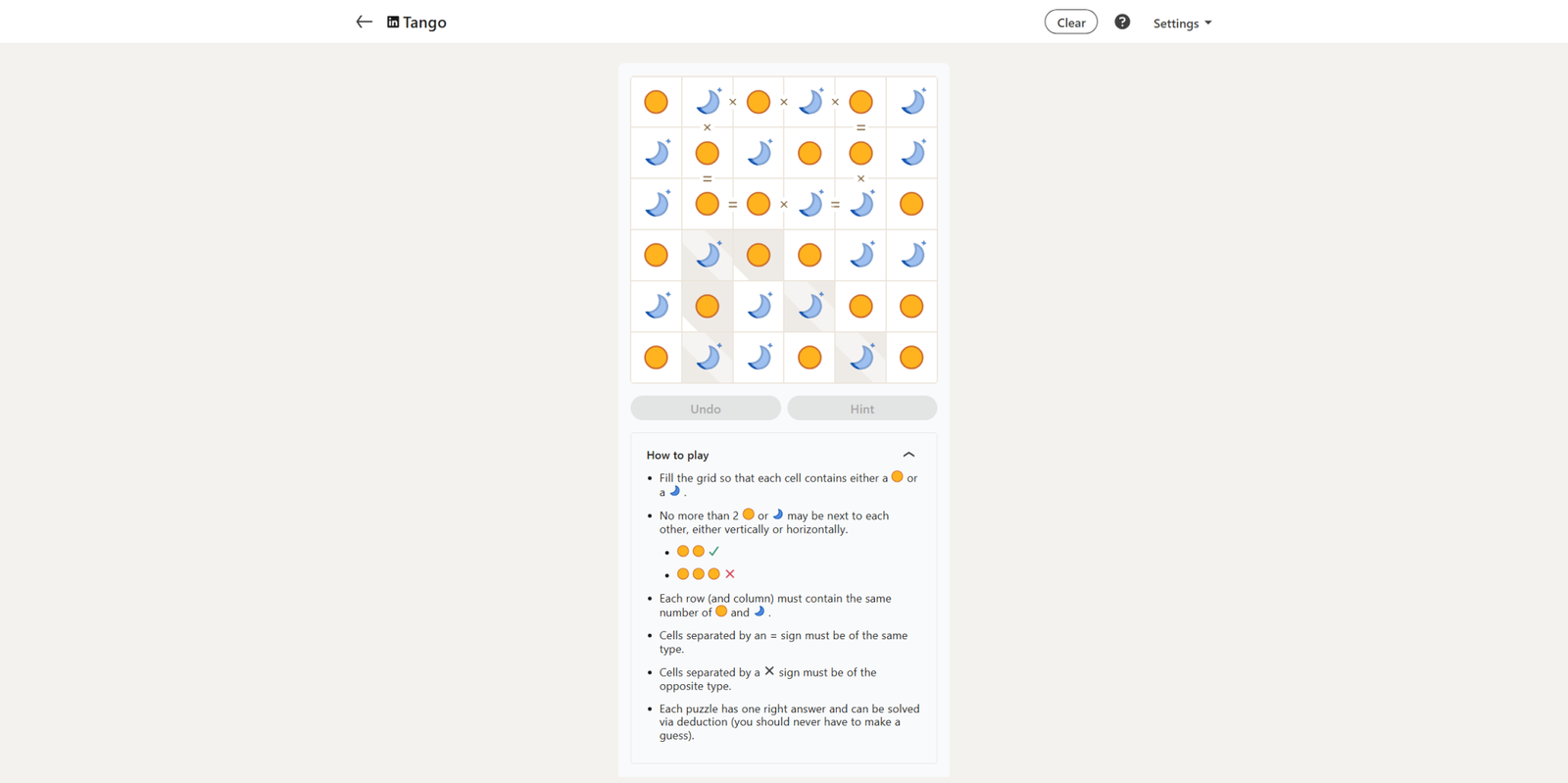 Сегодняшняя головоломка Tango довольно проста. Она начинается всего с шести заполненных квадратов, а остальная сетка автоматически заполнится символами X и знаками равенства.