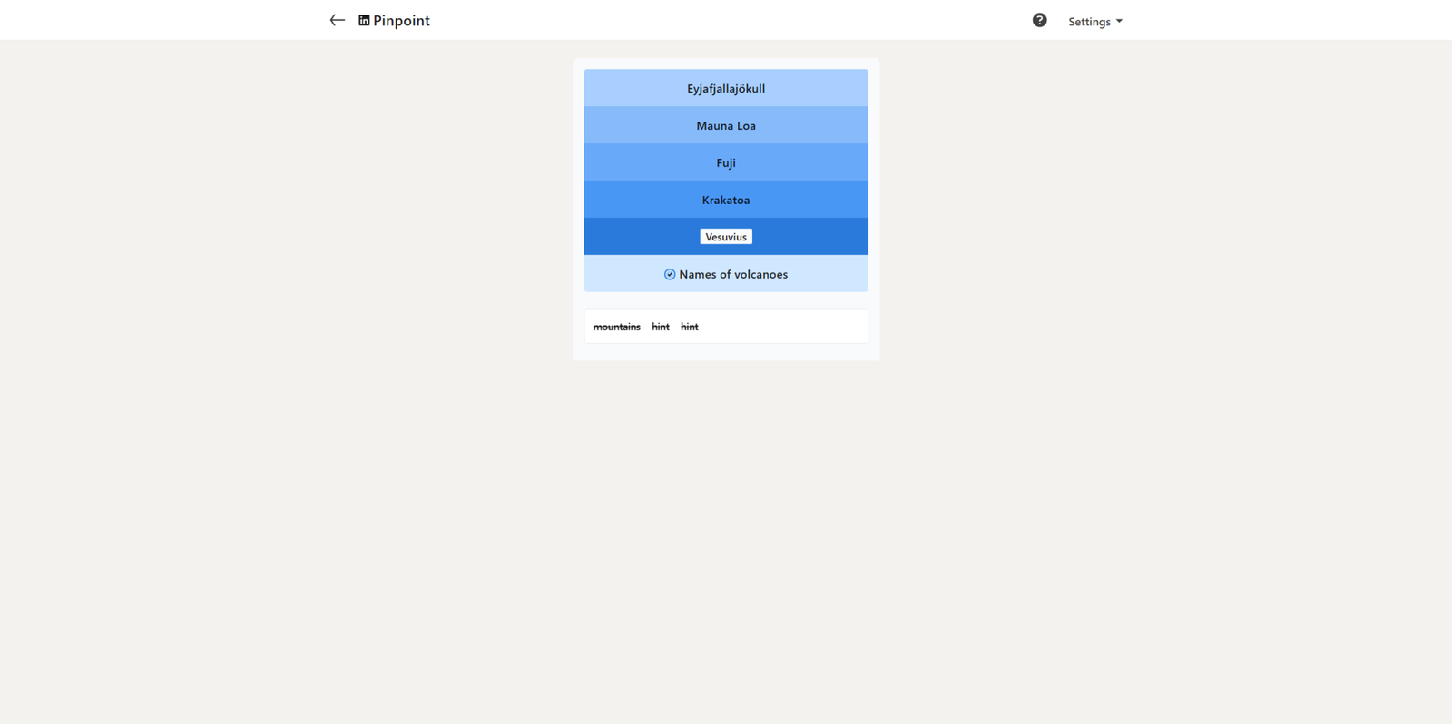 Сегодняшняя головоломка Pinpoint приятна и предлагает неплохой вызов. Первая подсказка, Эйяфьядлайёкюдль, может быть сразу узнаваема для некоторых из-за своей конкретики, но большинству игроков она, вероятно, покажется сложной. Вторая подсказка, Мауна-Лоа, сохраняет головоломку достаточно сложной даже после первой подсказки.