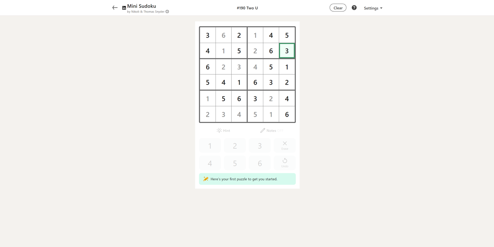Сегодняшняя мини-головоломка Судоку сосредоточена на шаблоне ‘Two U’ и начинается с четырнадцати уже заполненных чисел. Это значительно упрощает решение остальной головоломки, особенно учитывая, что одна строка почти завершена.