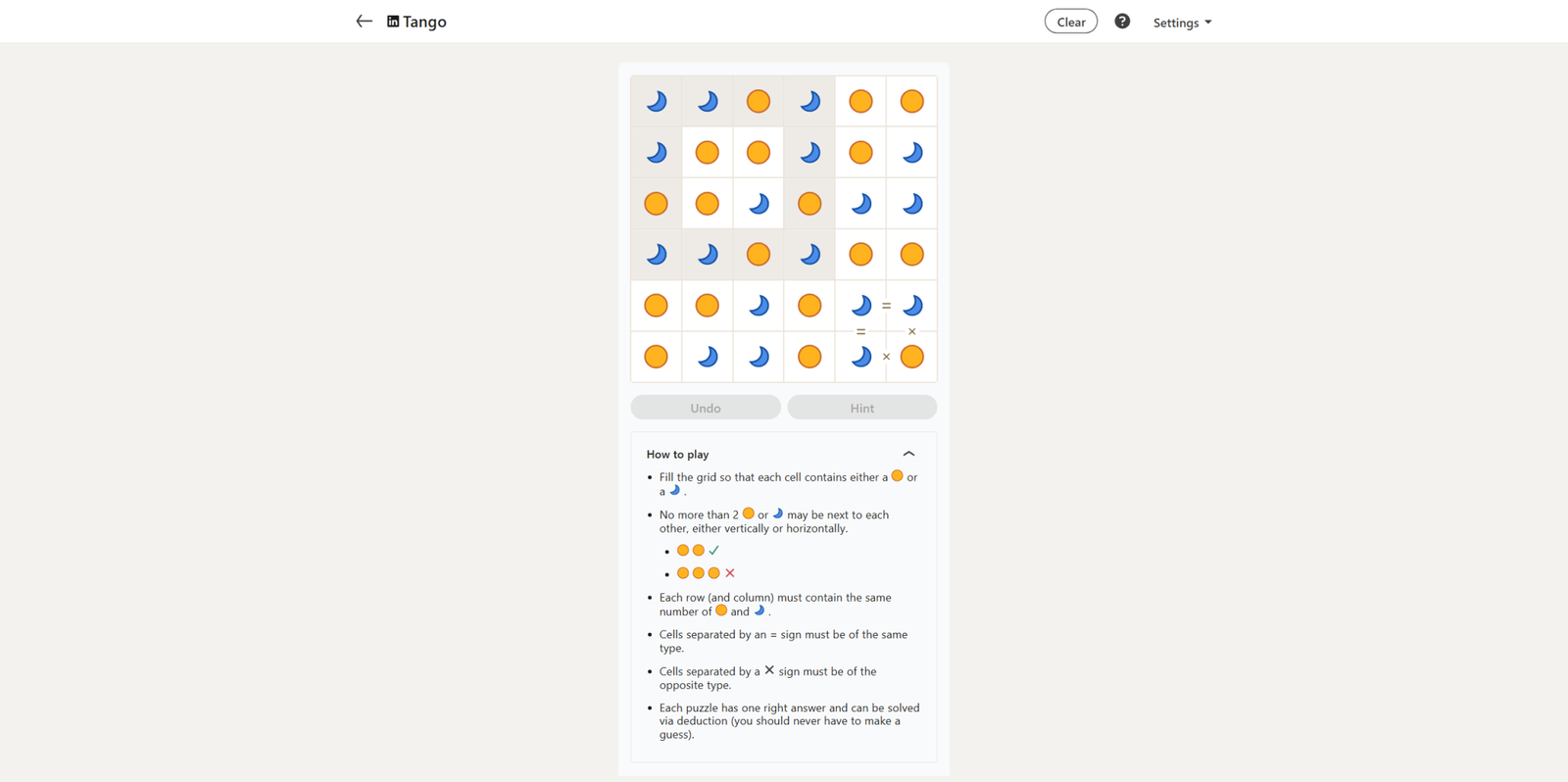 Сегодняшняя головоломка «Танго» такая же простая, как и вчерашняя, с двенадцатью уже заполненными клетками. Хотя полностью заполненных строк пока нет, она очень близка к этому.