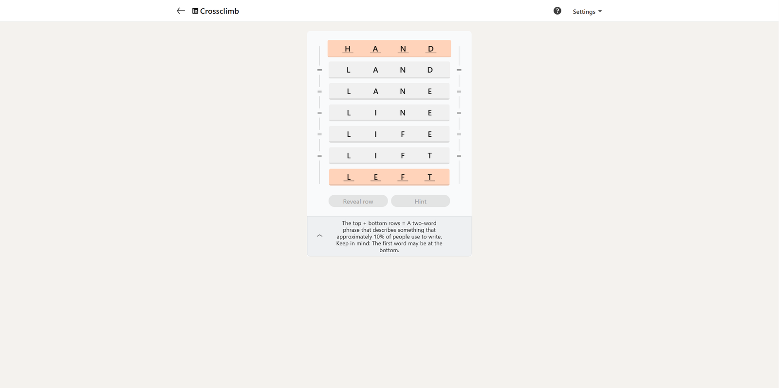 Вот решение для сегодняшнего LinkedIn Crossclimb: