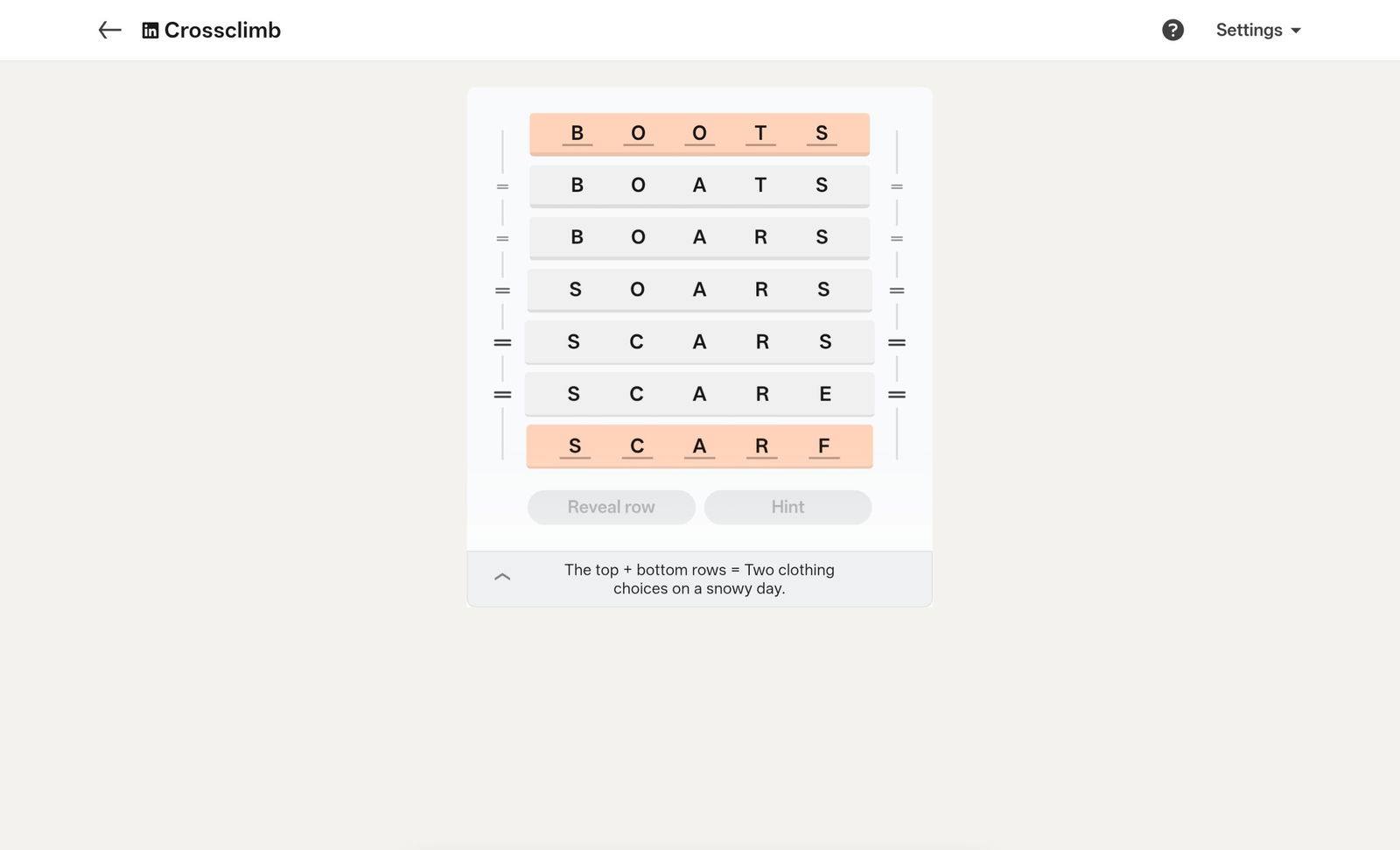 Вот решение для сегодняшнего LinkedIn Crossclimb: