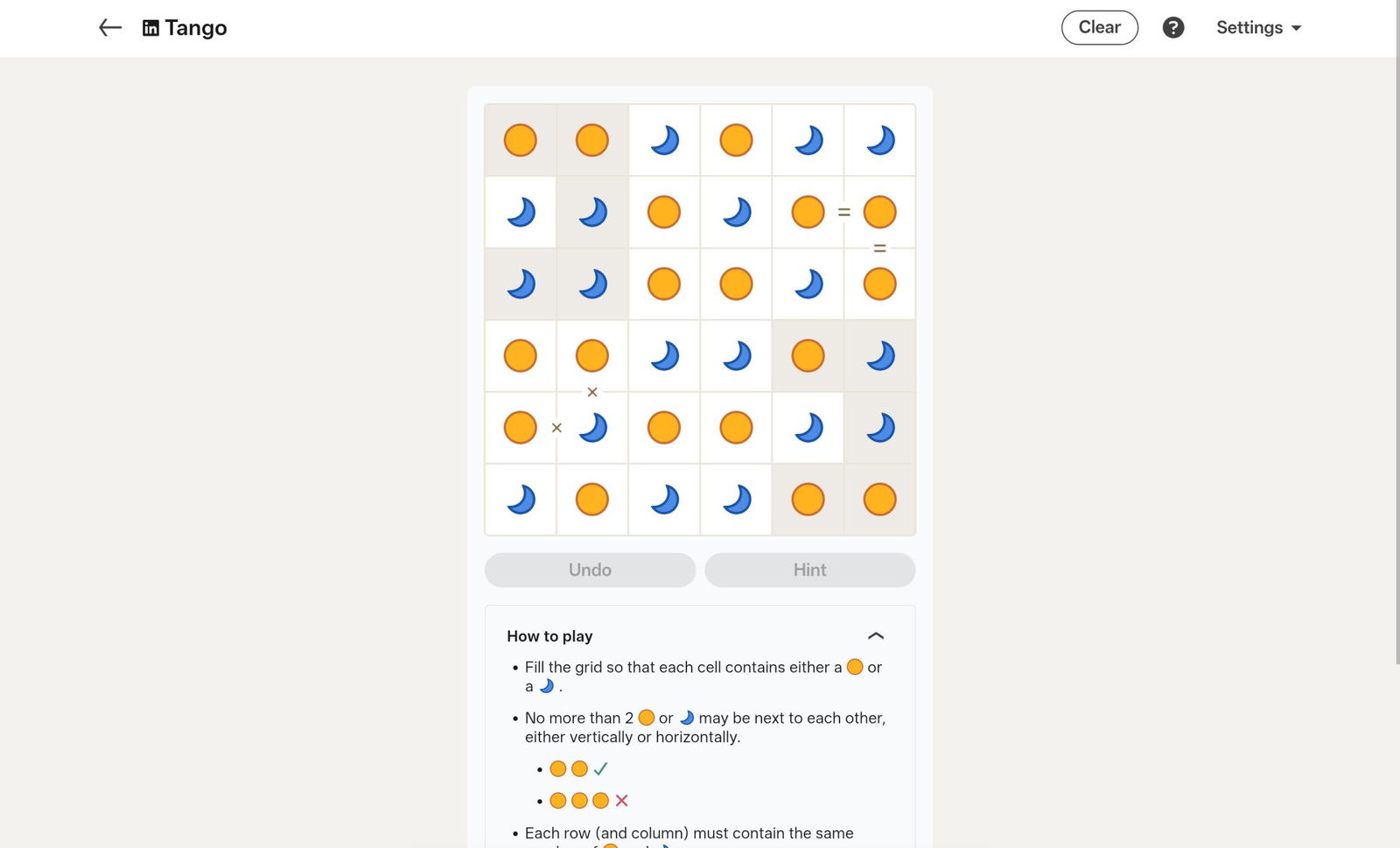 Текущая головоломка Tango довольно проста, начиная с десяти уже заполненных квадратов. Поскольку в ней много квадратов, удвоенных вдвое, остальная сетка быстро заполняется.