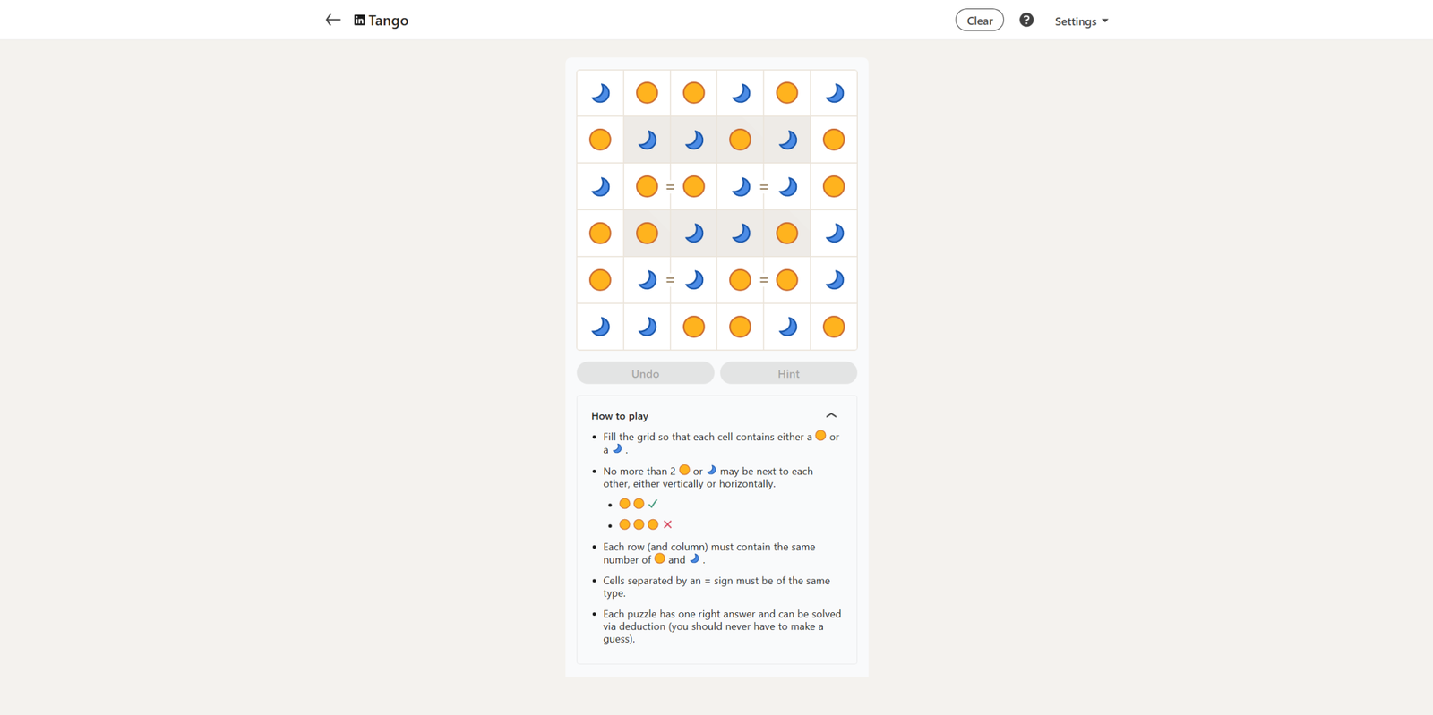 Сегодняшняя головоломка Tango относительно проста. Как и большинство, она начинается с восьми уже заполненных квадратов, а остальная часть сетки довольно легко решается.