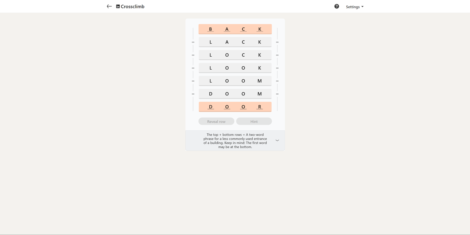 Вот решение для сегодняшнего LinkedIn Crossclimb: